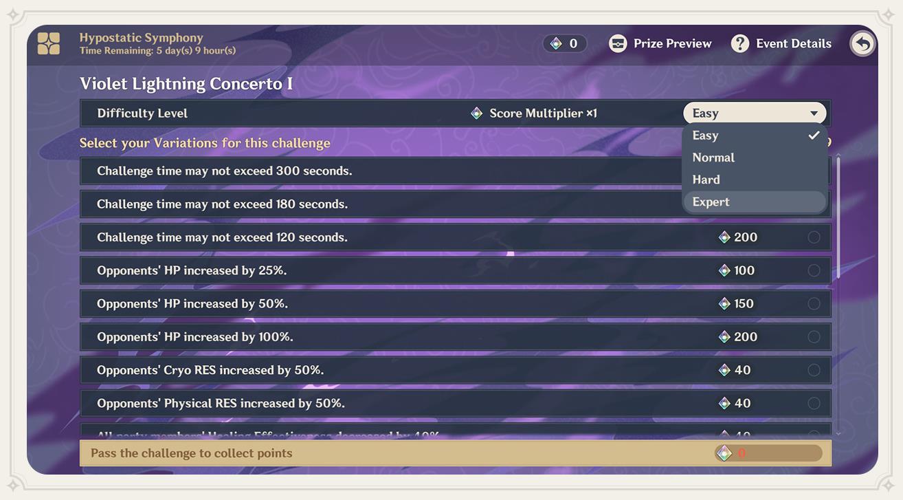 Only one boss/challenge, Violet Lightning Concerto I: Pure Electro Hypostasis, is available for now. The rest will be added each day until a week has passed.