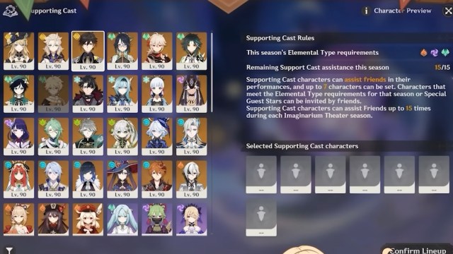 After choosing a difficulty you can then decide on six characters for your Principal Cast. You can choose from your arsenal of characters or trial characters. The six characters you chose as the Principal Cast gain Fantastical Blessings which are unique buffs. The cool thing about these buffs is that they’ll take effect both inside and outside the Imaginarium Theater until the end of the season.