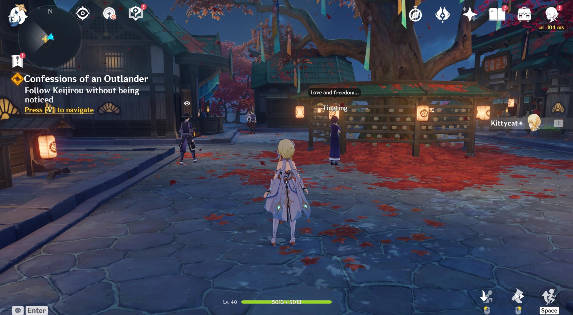 Foil Keijirou’s plans and a guard will get alerted. Once again, Thoma will smooth things over. Next, you’ll talk to the head of the Kanjou Commission who has some outlandish tasks. Fortunately, all you need to do is wait until it’s evening (1800 to 2400) so you can speak to his daughter Chisato. She’ll ask you to deliver a letter to her beloved in Inazuma City which is quite far away.