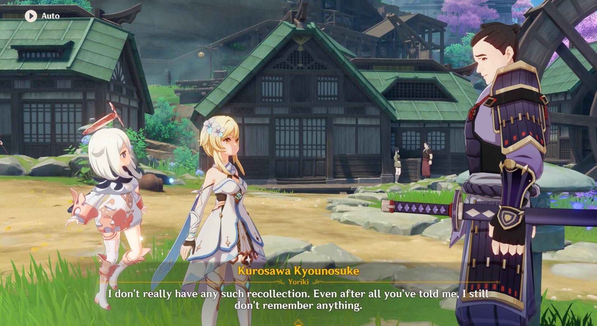 She’ll inform you that Kyounosuke seems to own a well-made sword. Once you speak with him, he admits that his memory is still hazy.