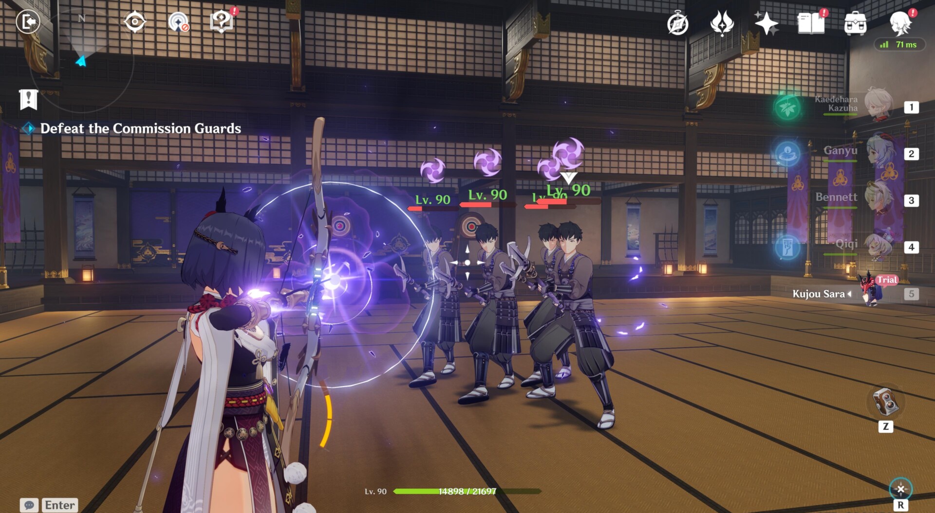- Anyway, travel back to Inazuma City and follow Kujou Sara to the Tenryou Commission’s HQ (the small building at the side of the castle/behind the Archon statue).