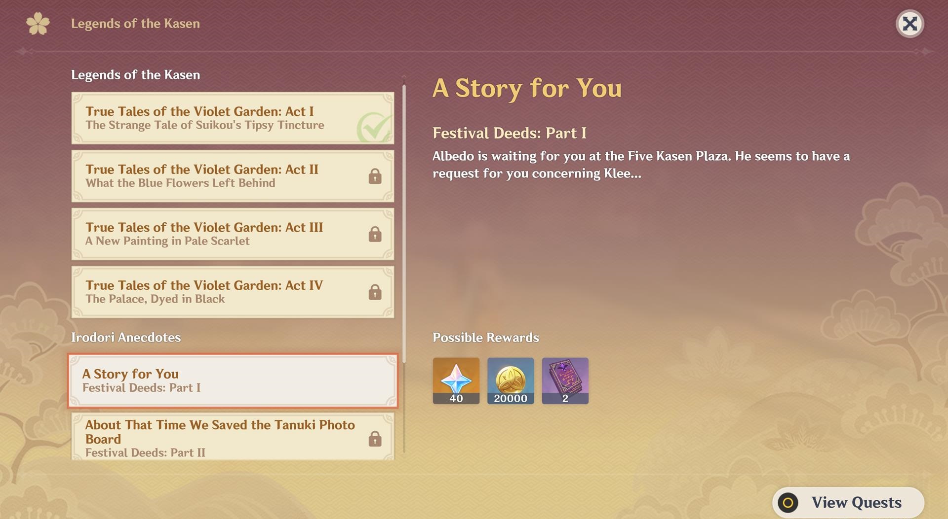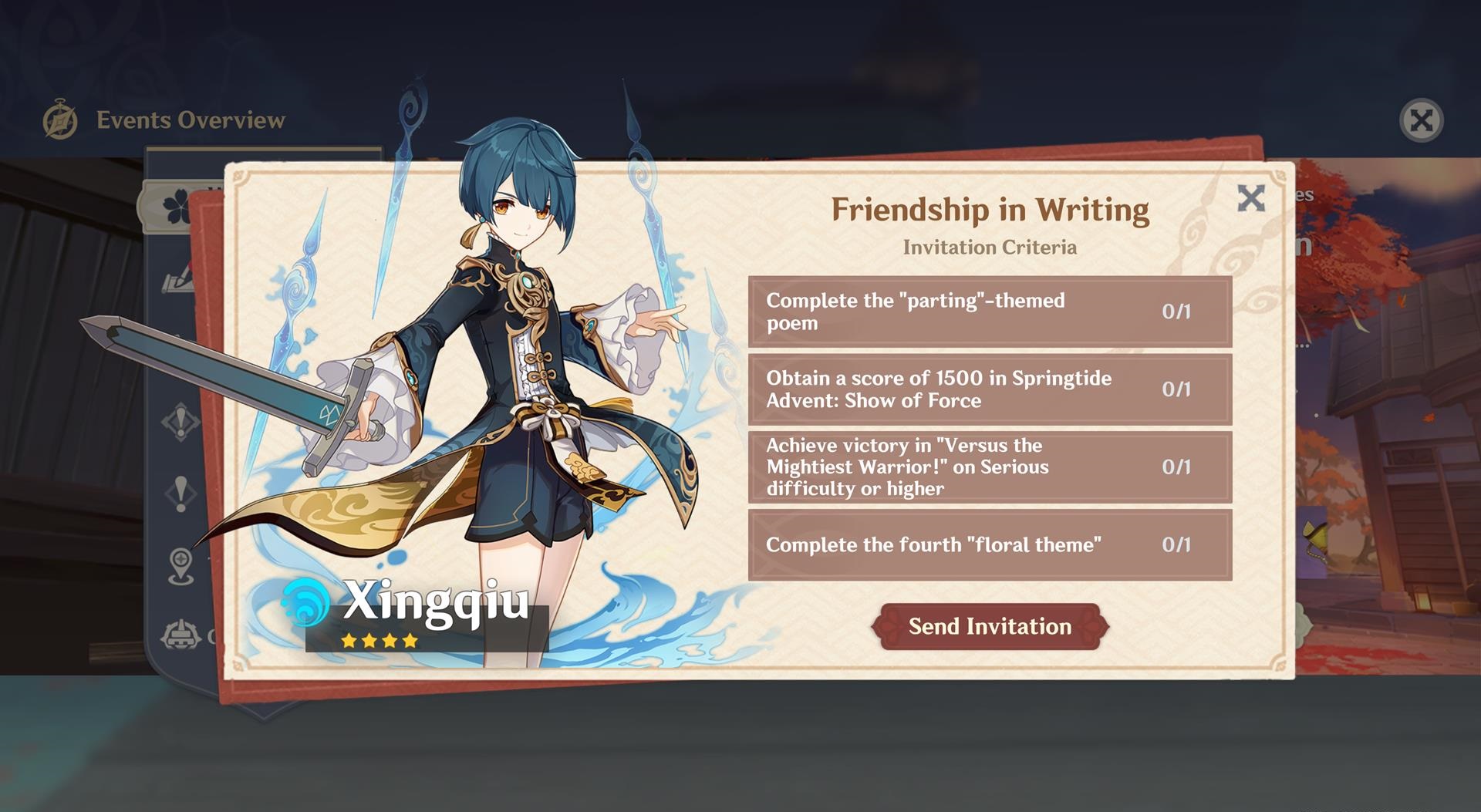 However, the most important reward in the Magnificent Irodori Festival and Hues of the Violet Garden event in Genshin Impact is your free Xingqiu. You’ll notice this once you click on “By Special Invitation” where the pre-requisites are listed: