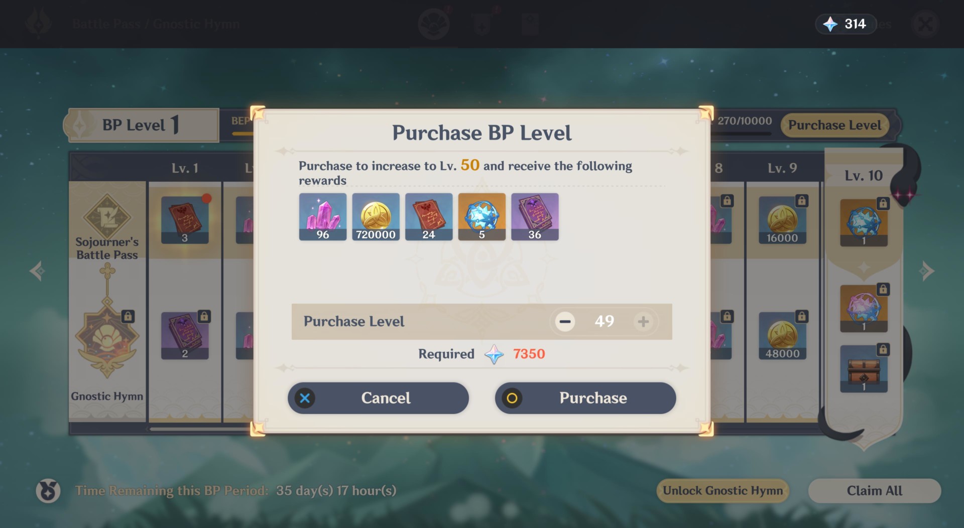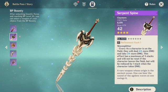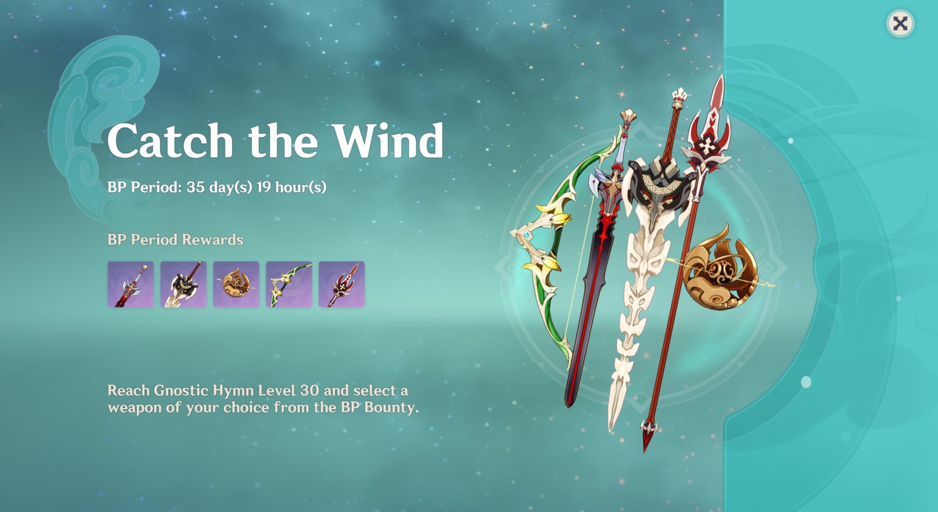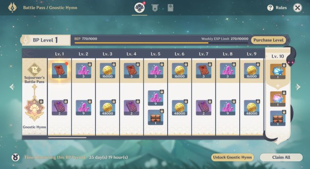 As such, it’s actually better to play normally without purchasing either the Gnostic Hymn or Gnostic Chorus. Then, before the duration of the Battle Pass has elapsed (ie less than 24 hours left), check and see if you’ve reached a decent rank. If you’re well past rank 30, then you could decide to purchase the Gnostic Hymn upgrade to grab the BP Bounty weapon alongside the other drops. In a worst-case scenario, one where you feel like you won’t have enough time, you could still spend Primogems (or Genesis Crystals converted into Primogems) to buy Battle Pass rank-ups.