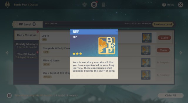 Genshin Impact‘s Battle Pass is unlocked once you reach Adventure Rank 20. Similar to the Adventurer Journal and other progression-based unlockable rewards, the Battle Pass has several tasks and requirements for you. Completing these will net you Battle Pass EXP (BP) and every level-up lets you grab additional rewards.