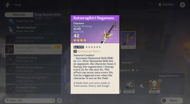 Like the other 4-star craftable weapons in the Inazuma region of Genshin Impact, the Katsuragikiri Nagamasa requires 50x Amethyst Lumps and 50x White Iron Chunk (plus a Northlander Claymore Billet). Mind you, this claymore is slightly similar to the Kitain Cross Spear, the final reward from the Orobashi’s Legacy quest chain in Yoshiori Island.
