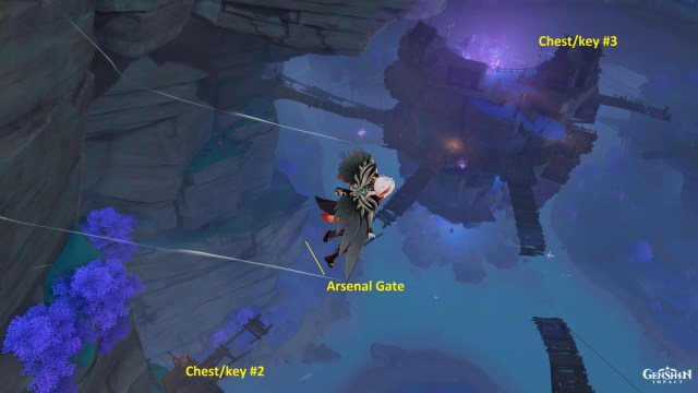 The third key for Genshin Impact‘s Katsuragikiri Nagamasa can be found near Tatarasuna’s Mikage Furnace. You’ll want to use the previous fast travel point at the southern cliffs. Get closer to Tatarasuna and glide until you reach the roof of one of the houses which has a chest.