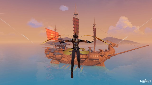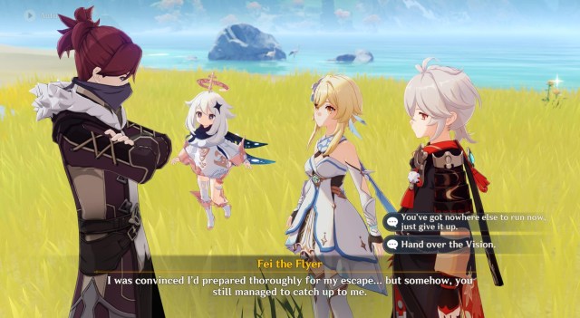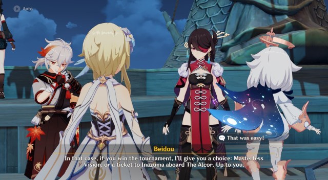 Once you’re on the ship, you’ll meet Beidou and Kazuha. It seems that Beidou has two particular prizes: a Masterless Vision (i.e., the objects that allow people to harness the elements) or safe passage to Inazuma aboard her ship.