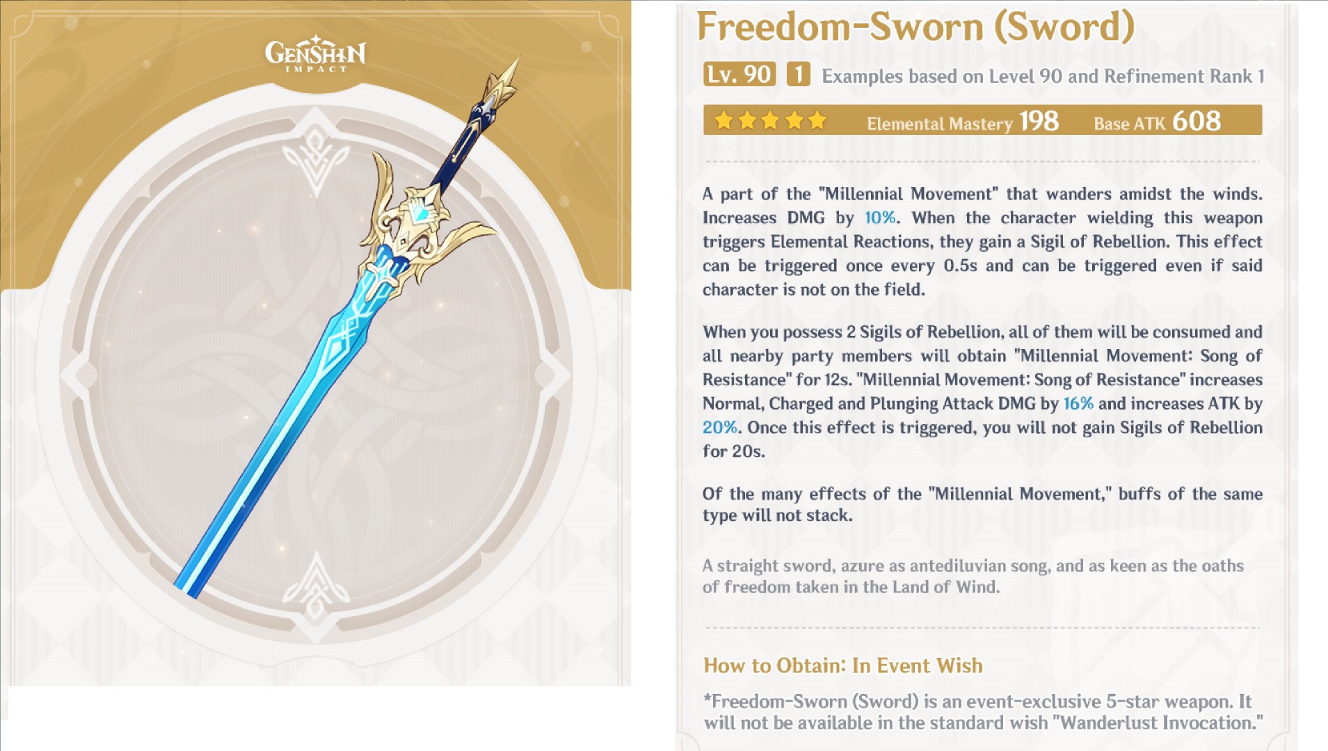 Freedom-Sworn (elemental mastery) – Freedom-Sworn (seen in the image below) happens to be one of the best 5-star weapons for Kazuha in Genshin Impact. This is primarily due to its elemental mastery sub-stat and its innate perks. It provides +10% damage and grants a Sigil of Rebellion whenever a character triggers an elemental reaction. The effect can even trigger if the character isn’t on the field.
