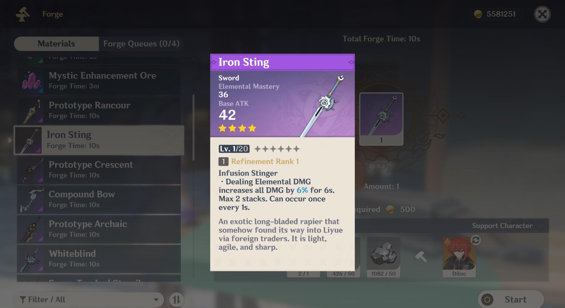 Iron Sting (elemental mastery) – Naturally, 5-star weapons can be very expensive to get, so you could simply opt for a 4-star substitute. This is where the Iron Sting comes in. It’s a decent free-to-play (F2P) alternative for Kazuha since it comes from the blacksmith’s forge. Likewise, the Iron Sting has an elemental mastery sub-stat, as well as the “Infusion Stinger” perk that increases overall damage by 6% for six seconds after you deal elemental damage (this stacks up to two times).