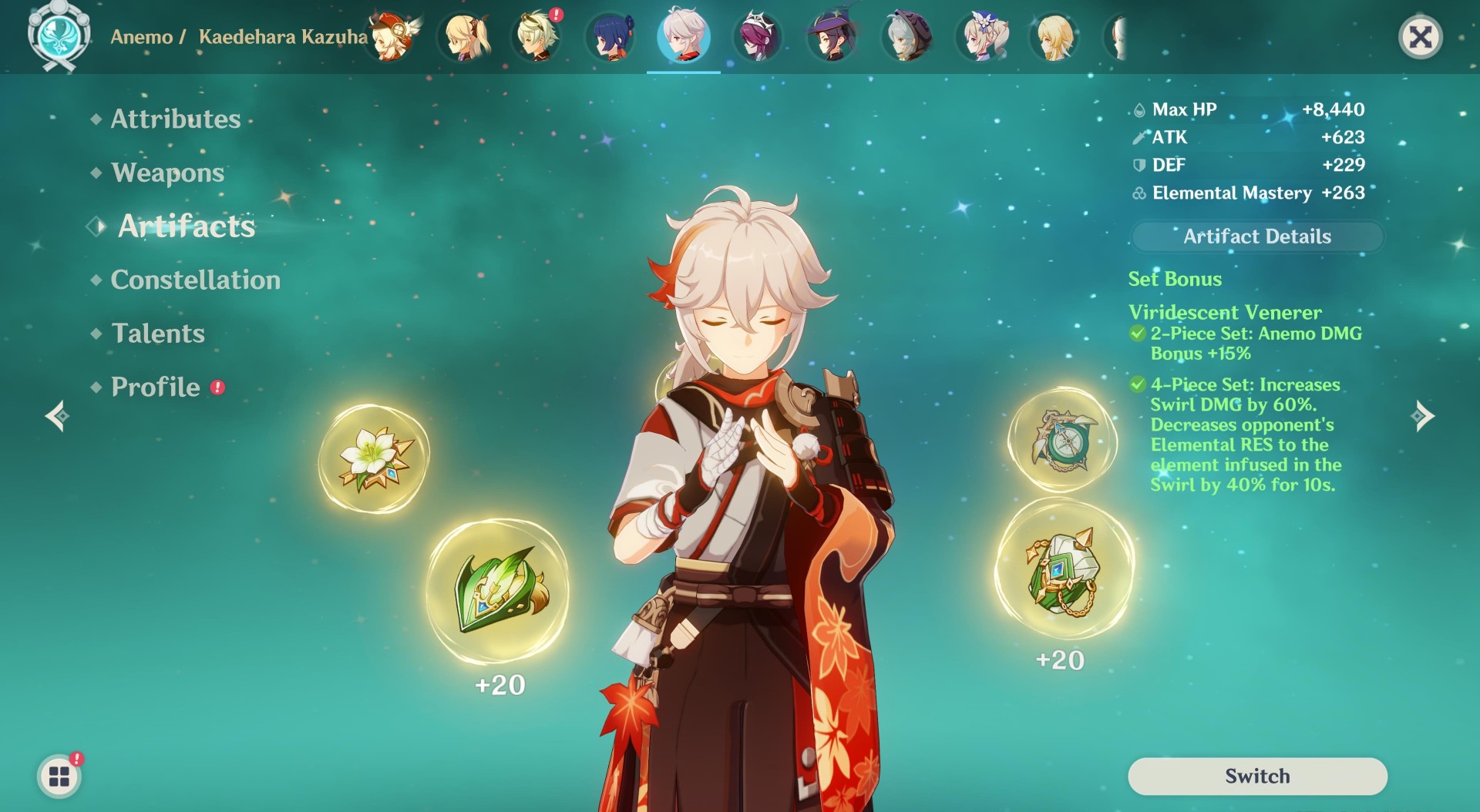 Then again, if you’re using party comps that aren’t too reliant on elemental reactions, you could also go with the Viridescent Venerer’s 2-piece bonus combined with the Gladiator’s Finale 2-piece bonus (+18% ATK). Alternatively, support-oriented Kazuha players can also try the Viridescent Venerer’s 2-piece bonus and the Wanderer’s Troupe 2-piece bonus (+80 elemental mastery). This option can aid you especially if you still need better 4-piece Viridescent Venerer rolls.