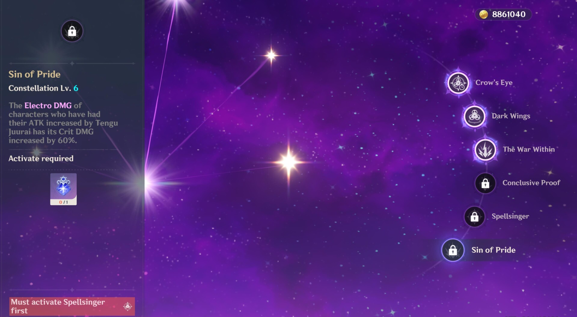 - C6: Sin of Pride – Characters who’ve had their ATK buffed by Tengu Juurai procs will have the crit damage of Electro attacks/abilities increased by 60%.