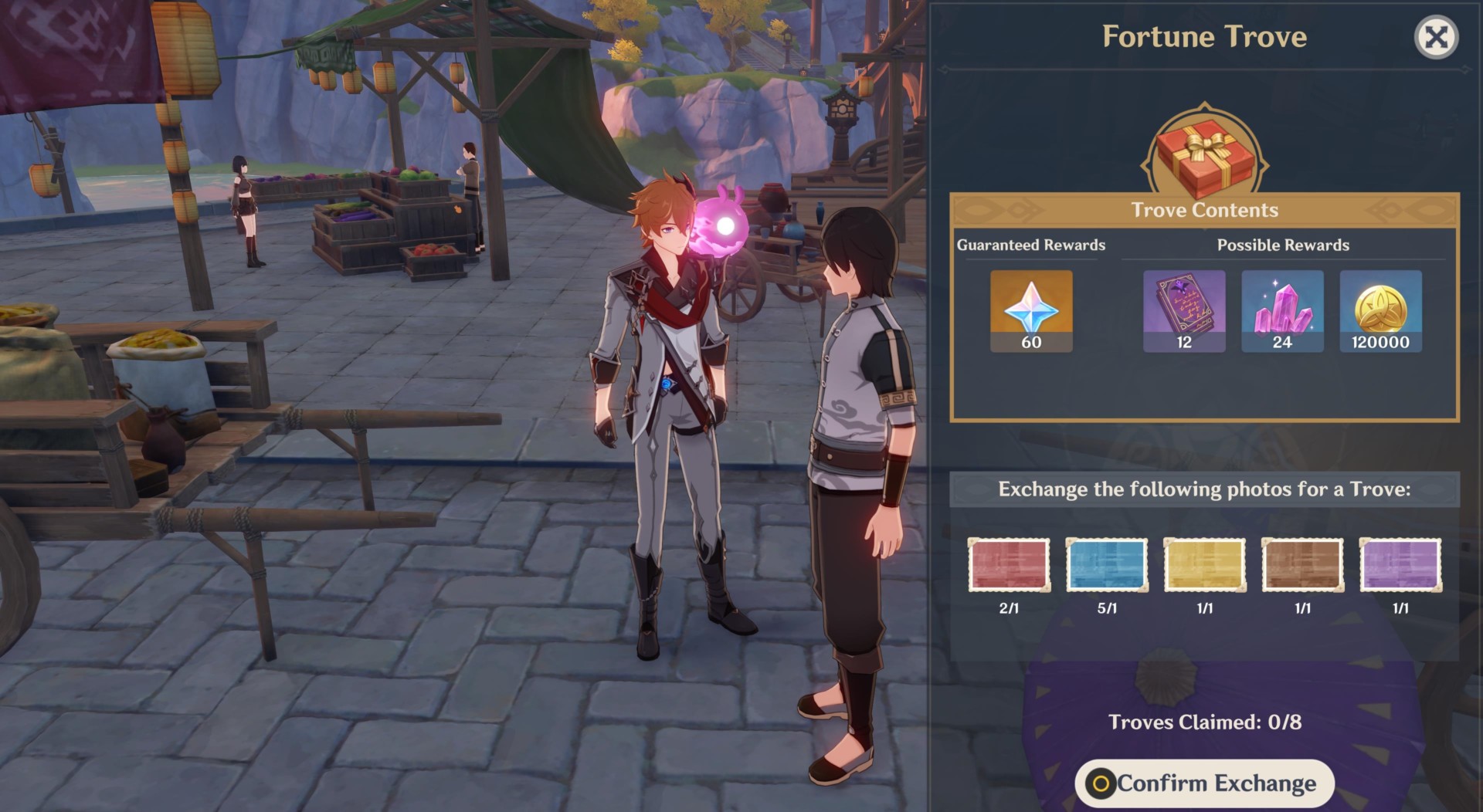 Each exchange nets you 60x primogems and either 120,000x mora, 12x hero’s wit, or 24x mystic enhancement ore. You can have a maximum of eight exchanges with Ji Tong while the event is ongoing.