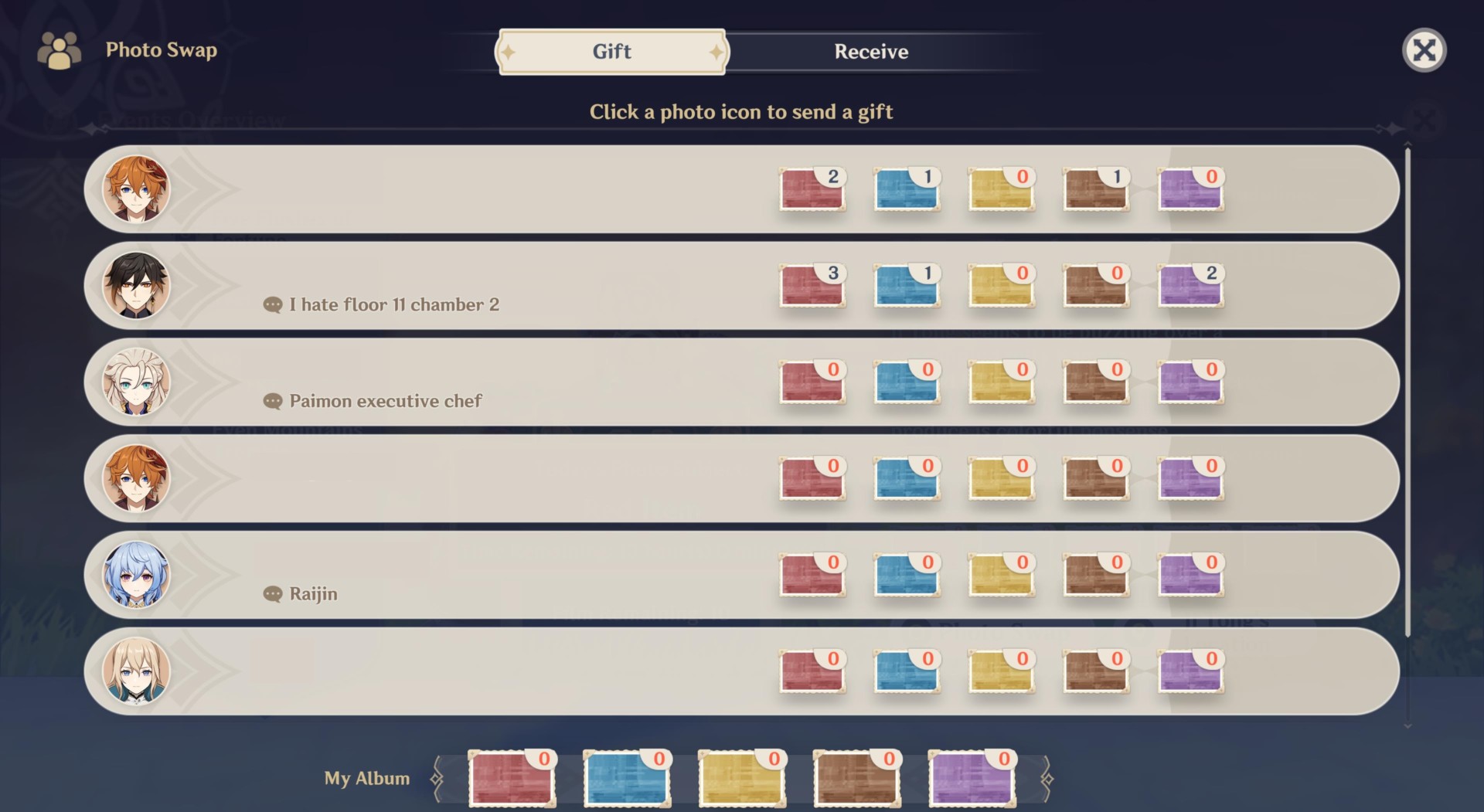 If you lack a particular photo color, you may use the “photo swap” option in the event panel. This will open a screen showing your Genshin Impact friends list, as well as the colorful photos they have collected. You can trade, swap, and ask your buddies to give you anything that you’re lacking.
