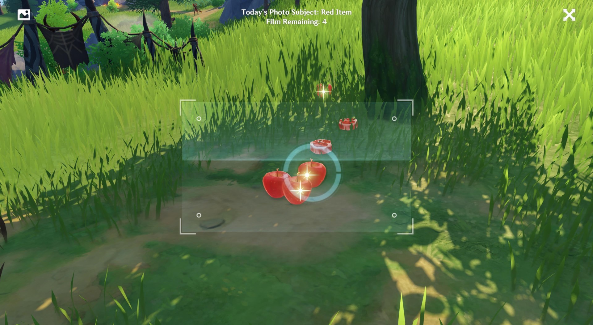 - Apples – These are found all over Teyvat. Apples on the ground and those on trees count separately, so you can take multiple photos from the same spot. These gave me ultramarine and pale gold photos.