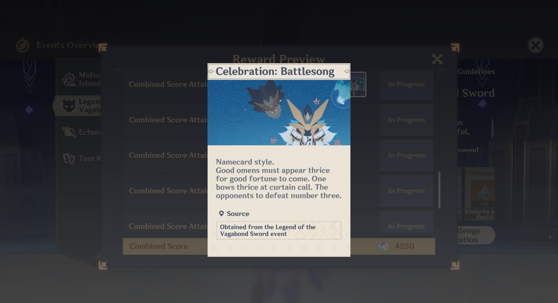 Note 1: The unique reward here is the Celebration: Battlesong name card which you can obtain once you reach 21,000 total points.
