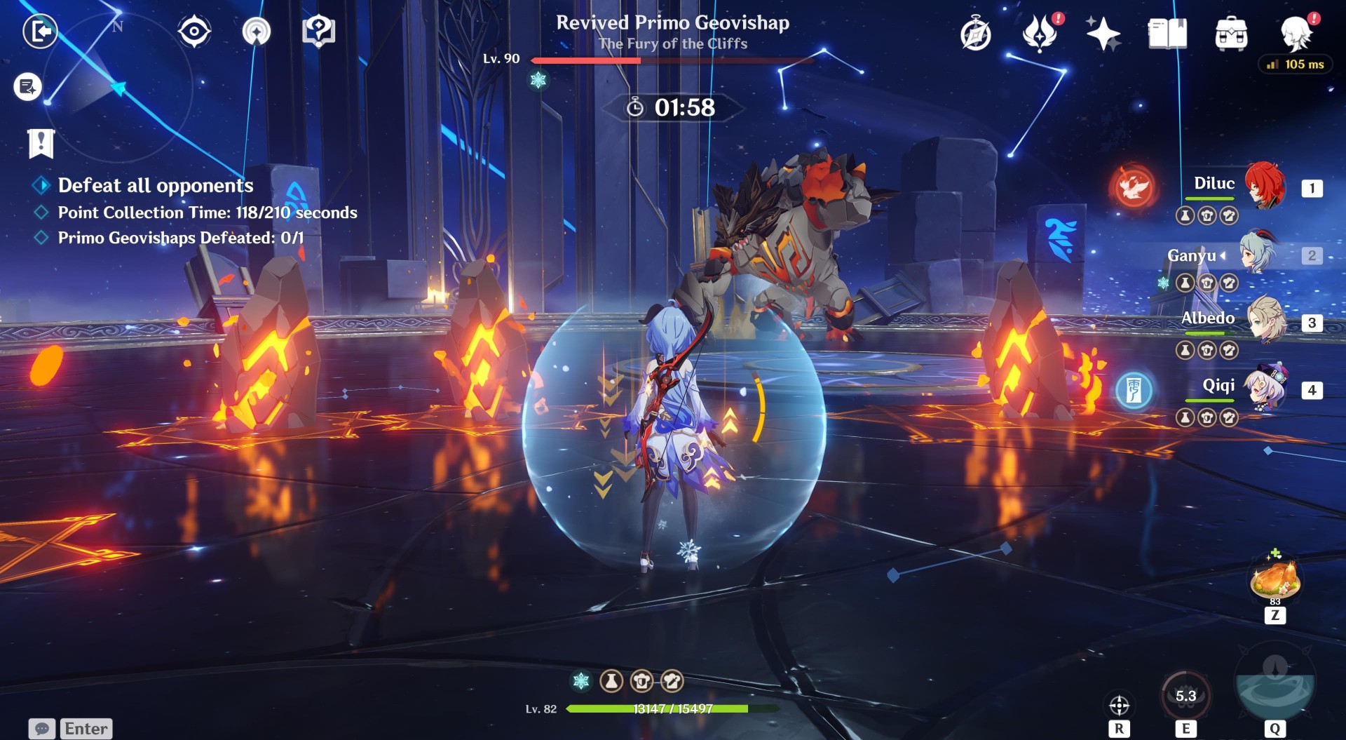 For my clear, I decided to use Qiqi, Ganyu, Albedo, and Diluc. Although Zhongli does have a +20% ATK bonus, I found that Albedo’s shields were more consistent. Additionally, I only opted to obtain 4,250 points (the bare minimum due to the event having seven challenge encounters). I picked Expert difficulty and had all the flairs enabled. I also selected the following main modifiers: