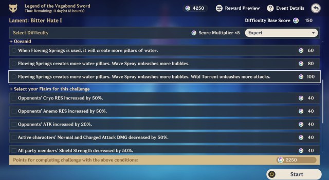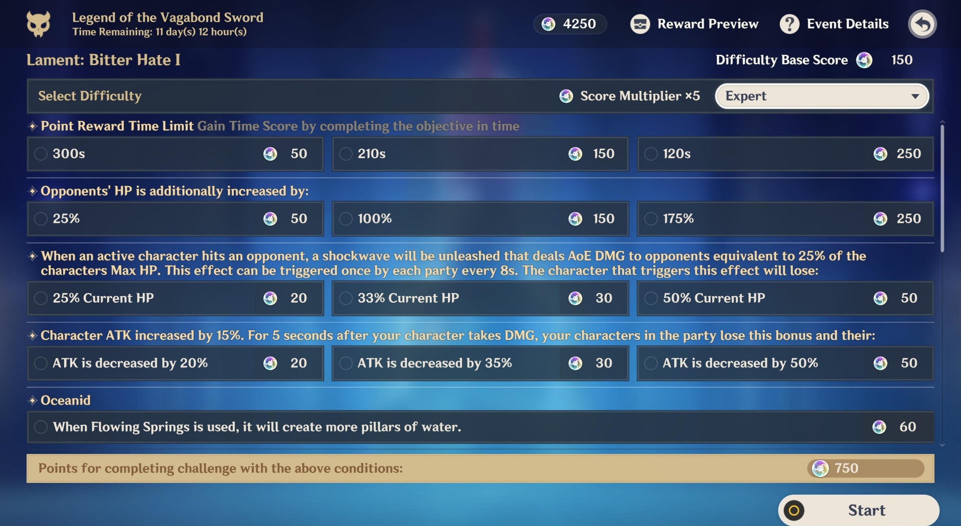 In my case, I only opted to get 4,650 points here with “Expert” difficulty selected. I chose a 210-second time limit and an extra 25% HP for enemies. I did max out the other modifiers.