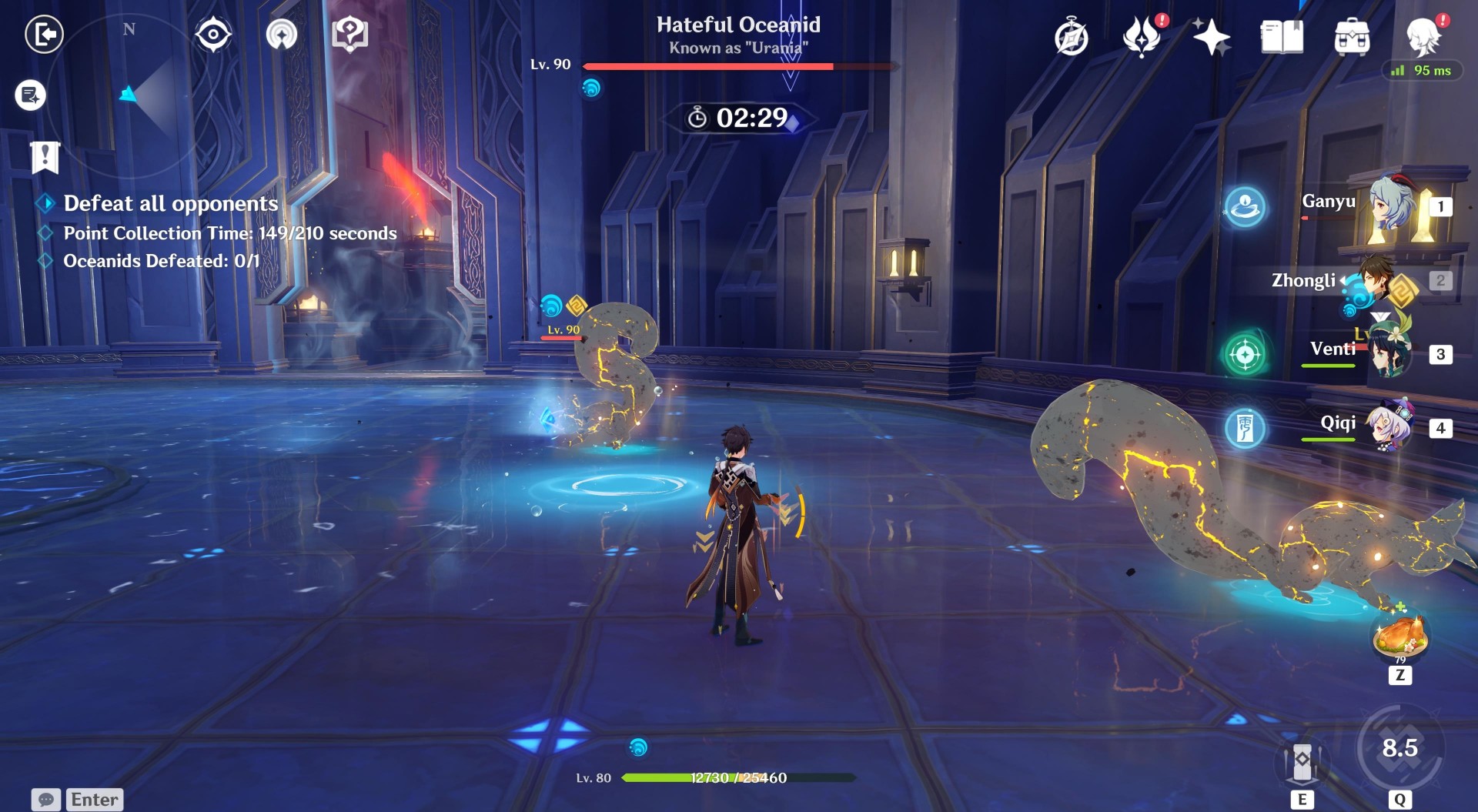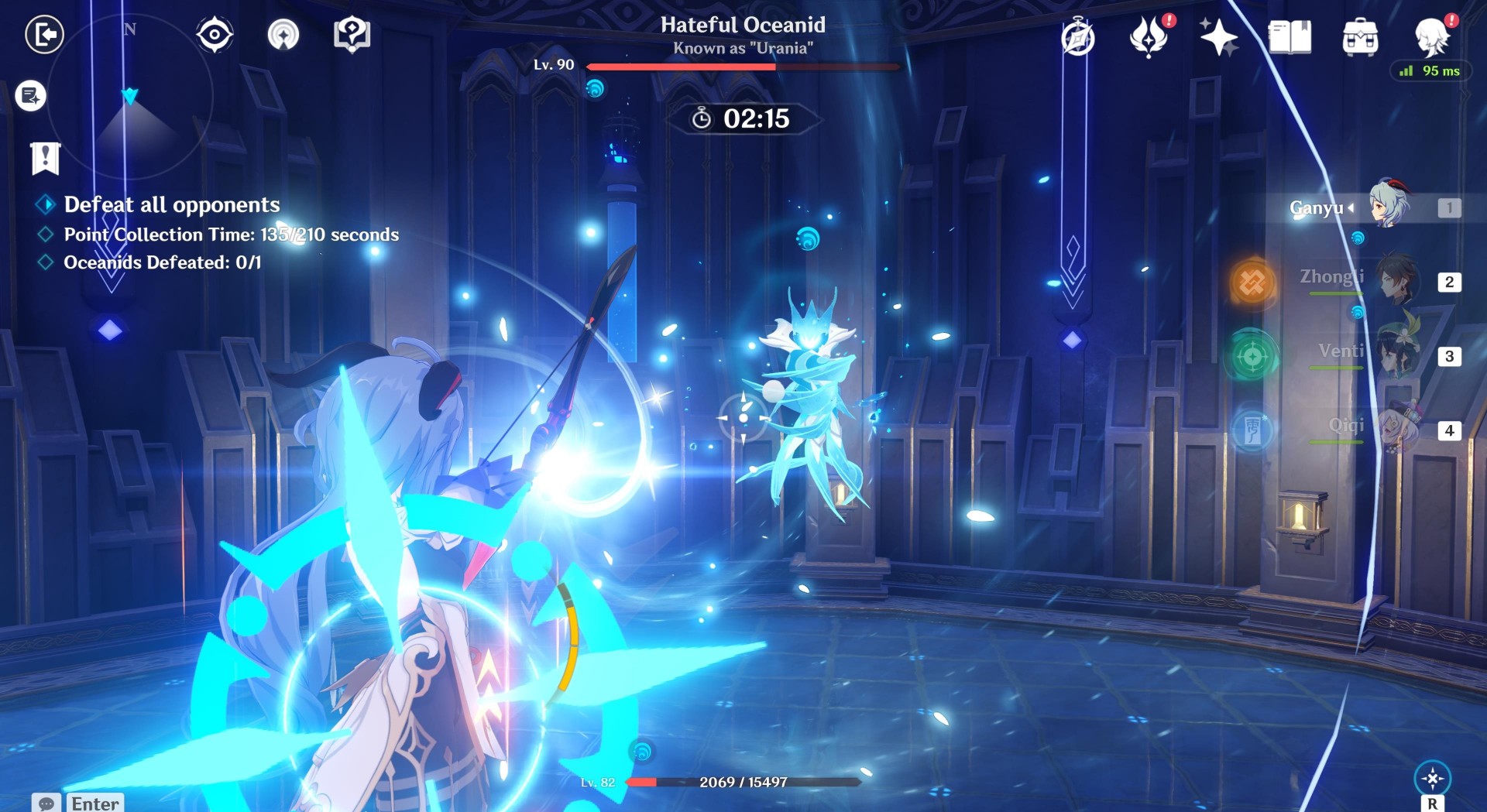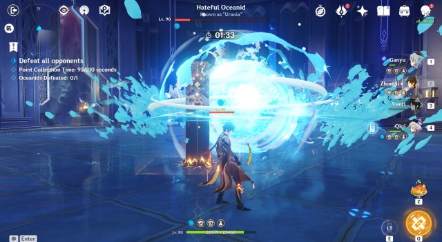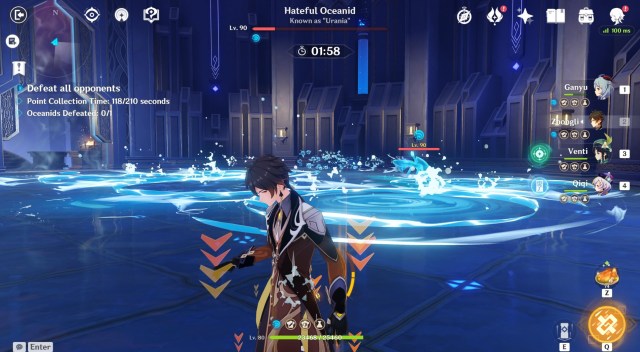 For my clear, I decided to use Ganyu, Zhongli, Venti, and Qiqi. Ganyu was my main DPS, and she’s invaluable due to her charged attacks while the Oceanid’s casting her ultimate and you’re on the Fitful Rapids elevator. Meanwhile, Zhongli’s there to block Water Bubbles and to help petrify mobs. Both Ganyu and Qiqi (as a healer) could also help with crowd-control thanks to their freezing capabilities. Lastly, I thought that I’d use Venti for his elemental skill that would allow me to stay airborne longer (in case I had to avoid an ultimate spell). But, this little quirk was completely unnecessary.