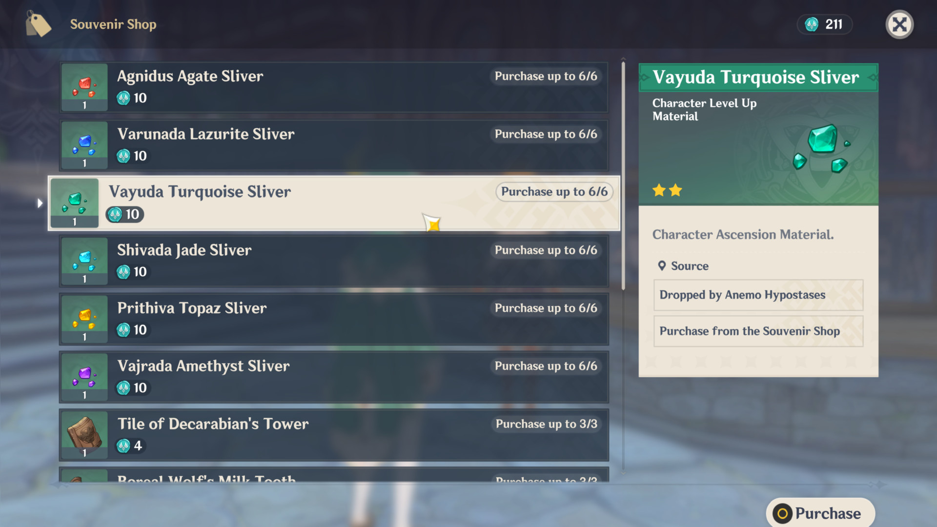 The Souvenir Shop can be found in the main hubs (i.e., Mondstadt and Liyue Harbor). Just look for the NPC with the diamond icon. The Souvenir Shop sells several Ascension-leveling materials such as Agnidus Agate Sliver and Vajrada Amethyst Sliver. It also has materials for leveling weapons/crafting.
