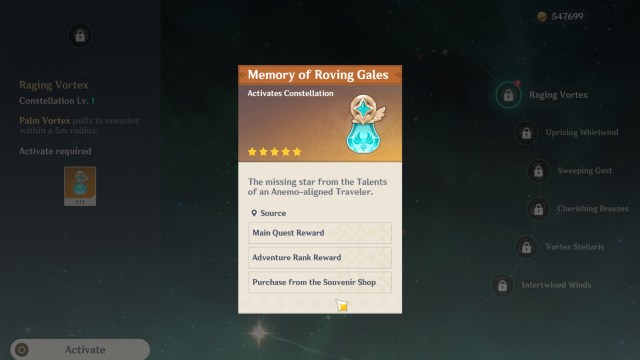 Other goals you can set your mind to are the Constellation-activating materials for your Traveler/main character called the Memory of Roving Gales. The one in Mondstadt has the Constellation unlock for your Anemo (wind-based) Traveler and the one in Liyue Harbor has the unlock for the Geo (earth-based) main character.