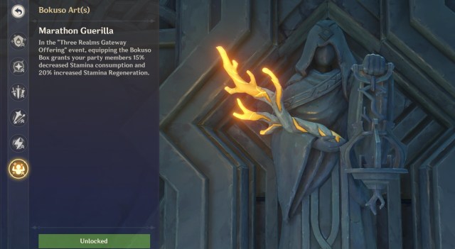 - Marathon Guerrilla – This is by far the most useful among the Bokuso Arts in Genshin Impact. Consider how Enkanomiya has a lot of cliffs, ruins, and chasms, and you’ll know that there’d be loads of running, climbing, and gliding.