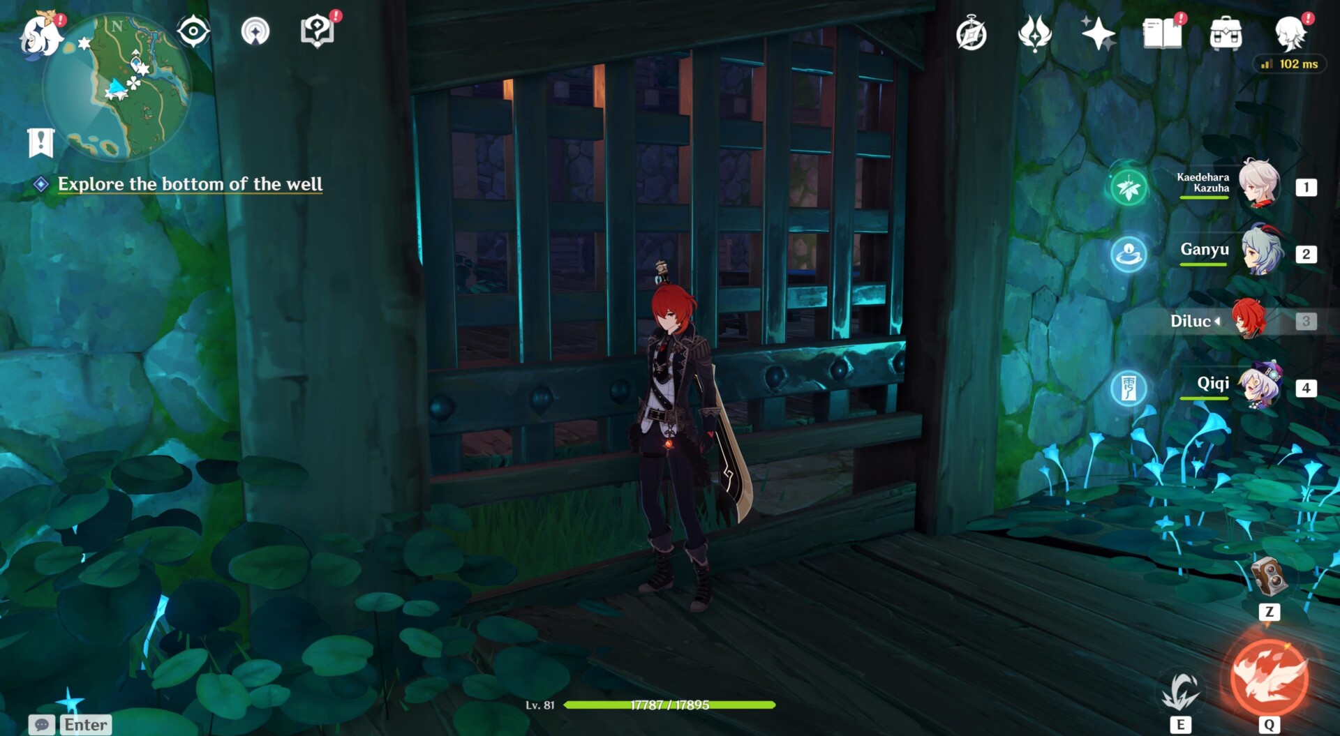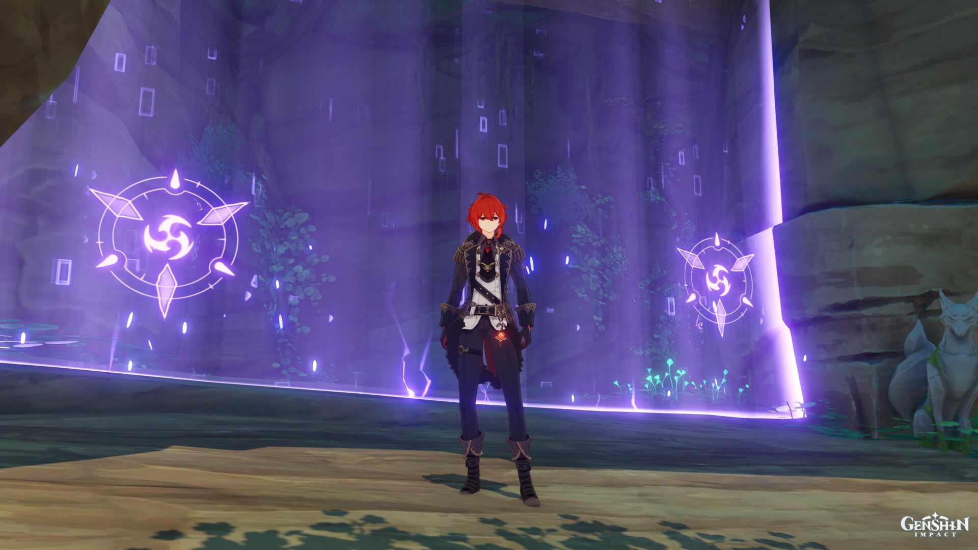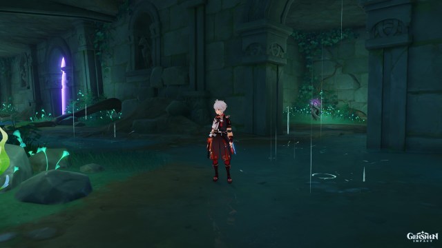 The path to the right of the corrupted shrine has a puzzle that drains the water. Below that is an Electrograna, but, just like the Grand Narukami Shrine’s barrier, you can’t enter the room with the loot and Electroculus unless you’ve leveled up your perk.