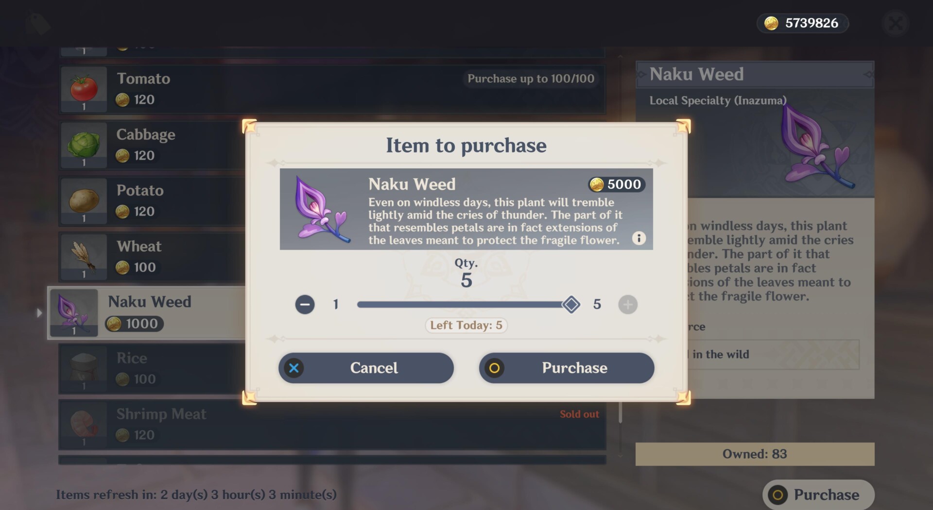 If you go to Inazuma City, you can purchase 5x Naku Weed every couple of days from a groceries vendor named Aoi. Her store is near the fast travel point.