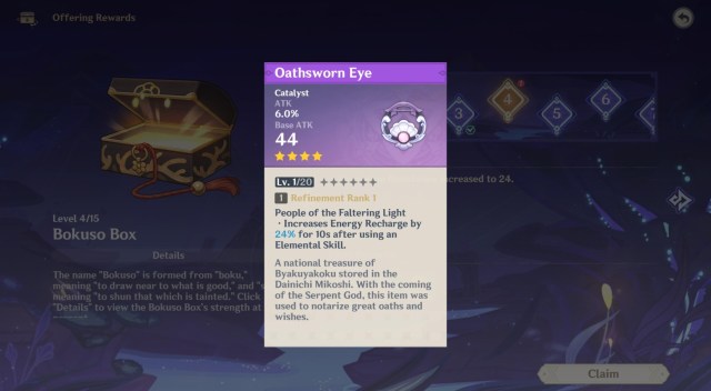 Once you’ve reached level 4 on your Bokuso Box, you should be able to claim the Oathsworn Eye catalyst in Genshin Impact. But, is it actually good?