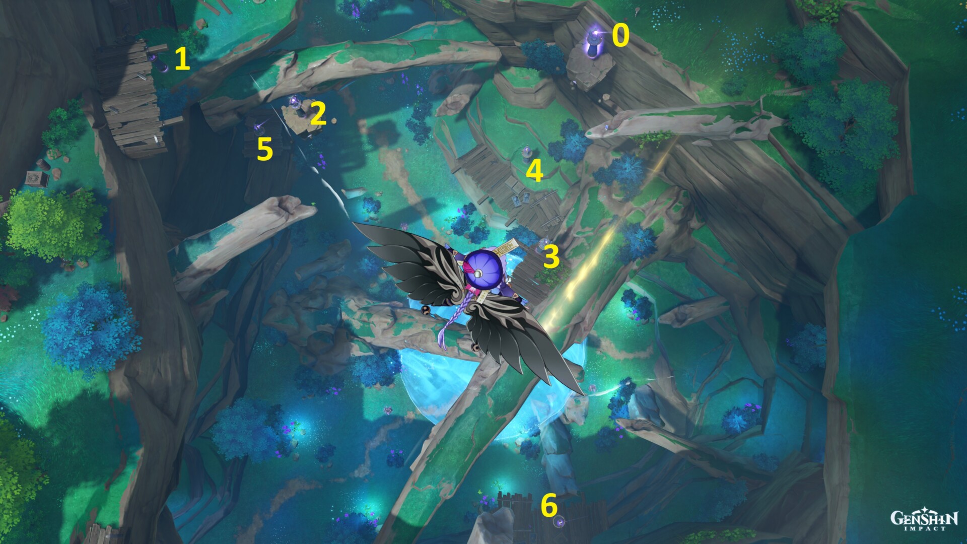 - Pillar 1 – Targets the nearby pillar down below that’s on a ledge (2).
