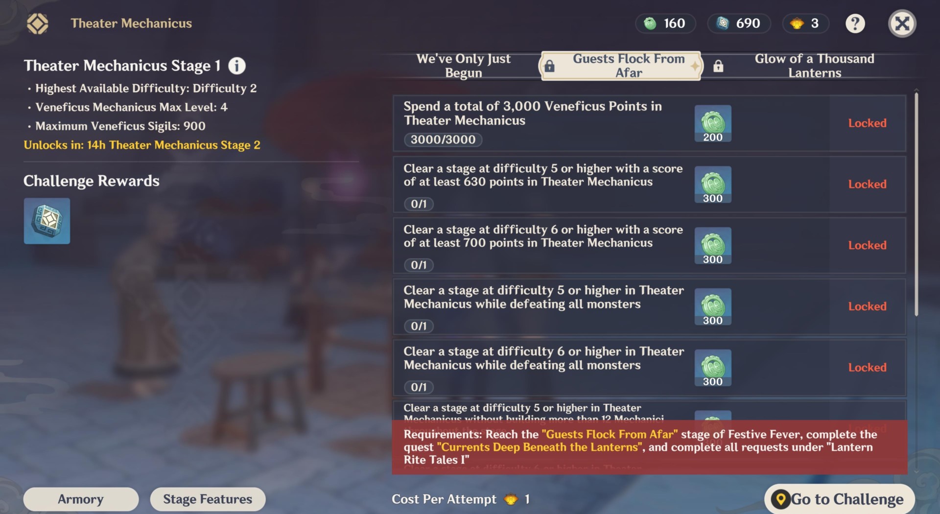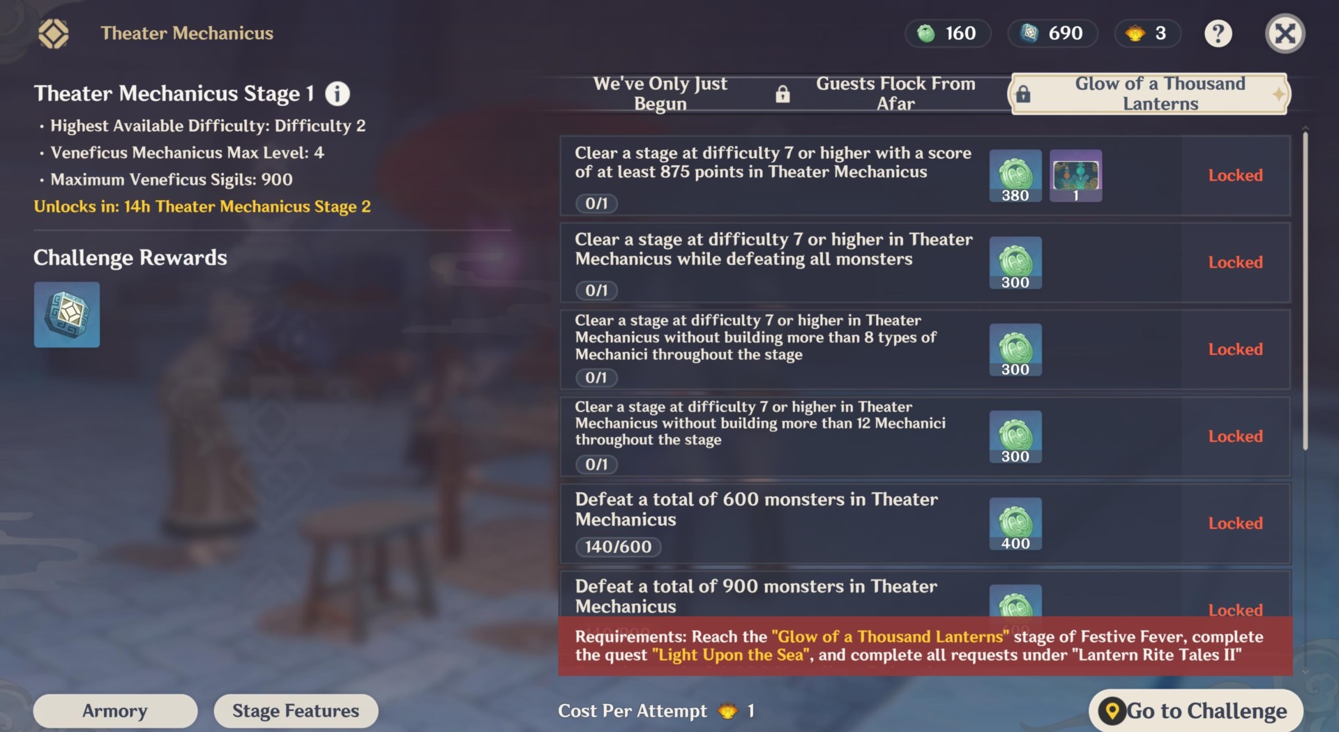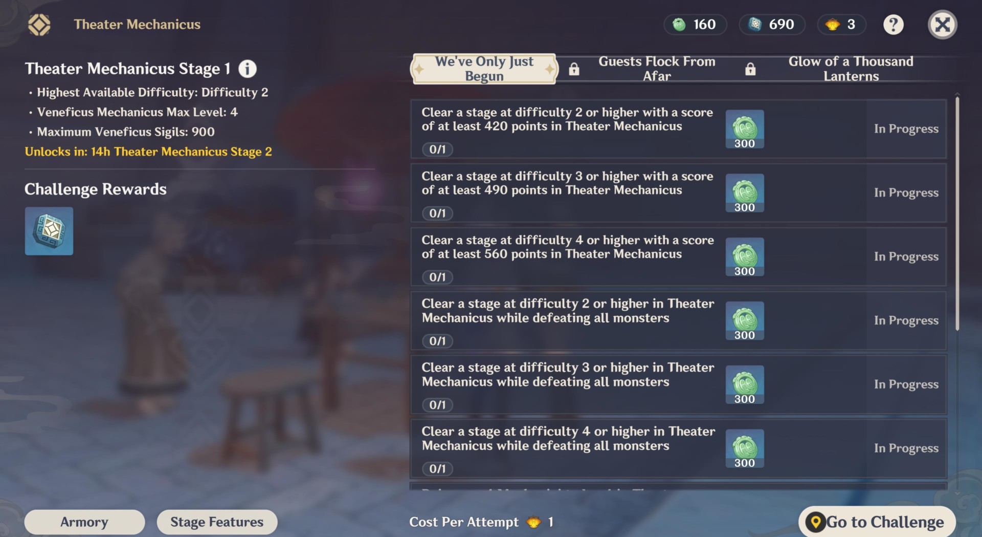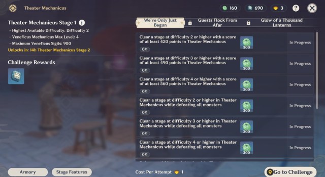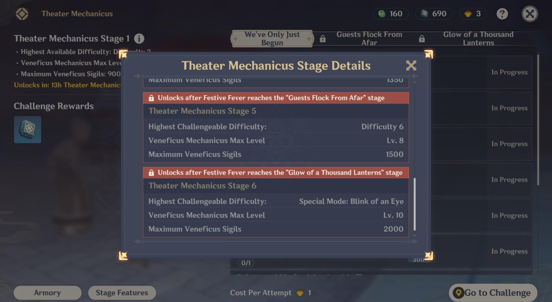 Open Genshin Impact‘s event panel and go to Lantern Rite -> Theater Mechanicus to see the current phase and various difficulty levels.