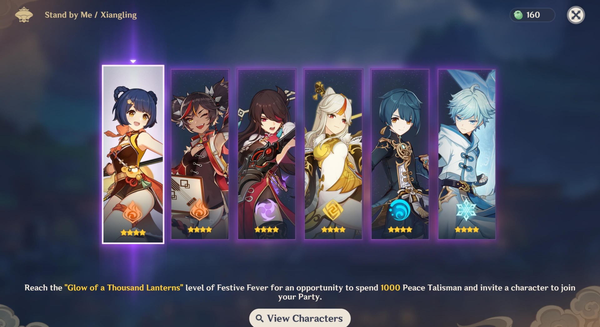Alternatively, you can make sure that you’ve already reached the “Glow of a Thousand Lanterns” Festive Fever stage. You can then spend 1,000 Peace Talismans for one 4-star character. You can choose from Xiangling, Xinyan, Beidou, Ningguang, Xingqiu, or Chongyun.