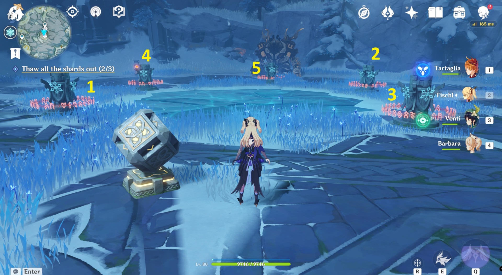 You’ll notice several Ruin Guards that seem to be slumbering. Next, take a look at the Seelie that’s floating on top of a switch. It’ll float towards various Cryo totems that need to be activated in order.