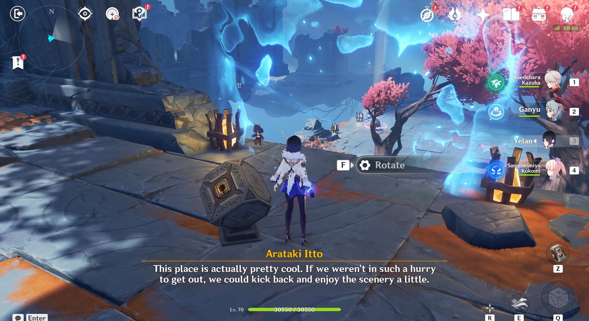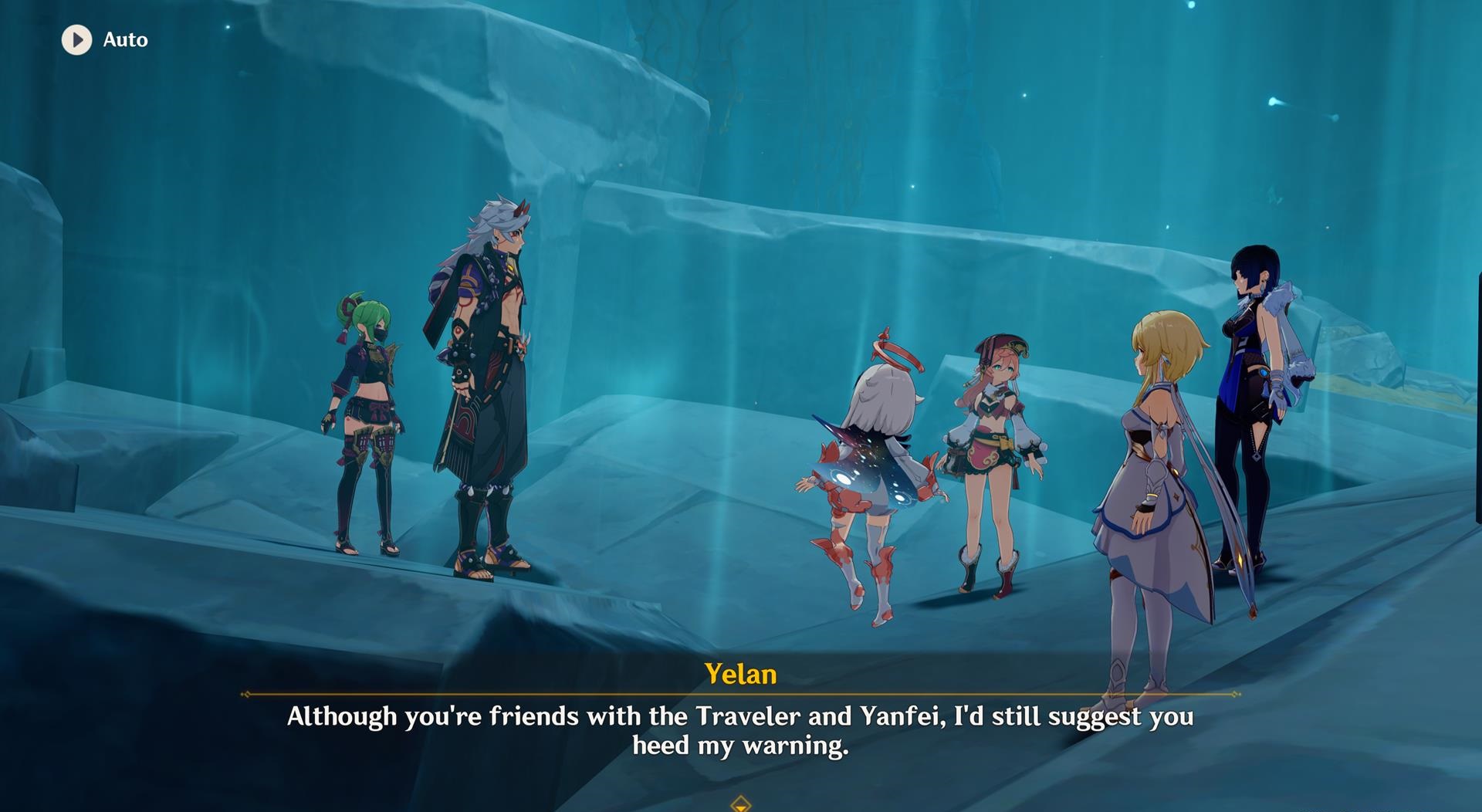 There’s a bit of animosity between Itto and Yelan. Before the two could duke it out, though, the ground rumbles and the group falls down a pit. Finally, Xiao appears, chiding everyone before teleporting away (classic Xiao!).