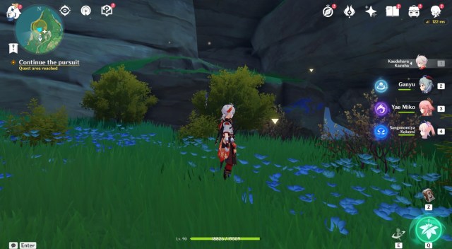 Ei tells you to head to a cave beneath Grand Narukami Shrine. This isn’t the pit where we fought the Miasmic Tumor. Rather, it’s the one along the northern cliffs of the shrine. There’s an Electroculi plant on a floating rock that you can grab to pass through the barrier.