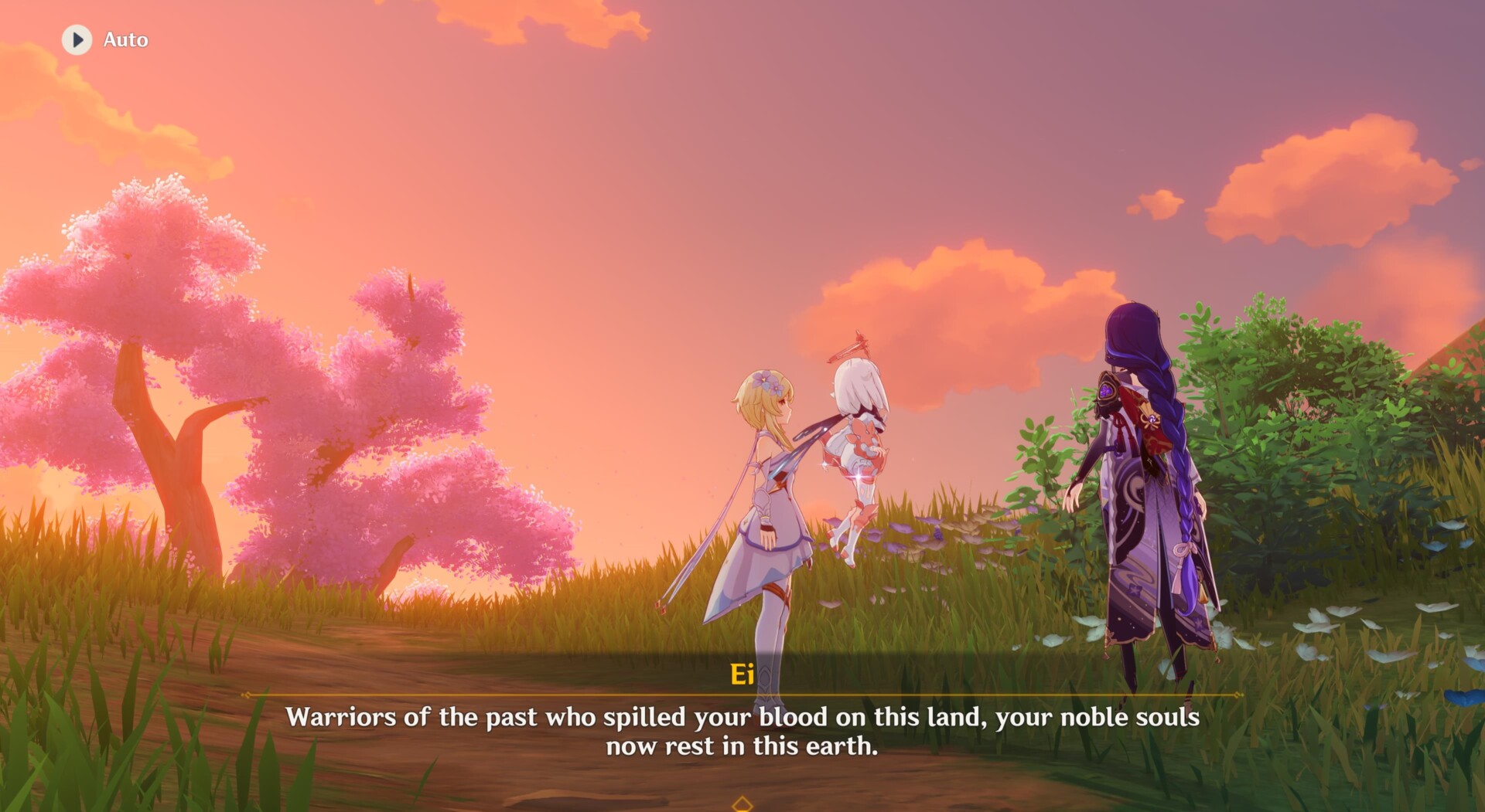 Story-wise, the Ei who’s with you is the twin of Makoto, the original Raiden Shogun who died in the realm of Khaenri’ah. Around this time, Inazuma was also getting ravaged by monsters. Ei recounts how the Sacred Sakura Tree appeared suddenly, and yet it felt as though everyone had known that it had always existed (weird).