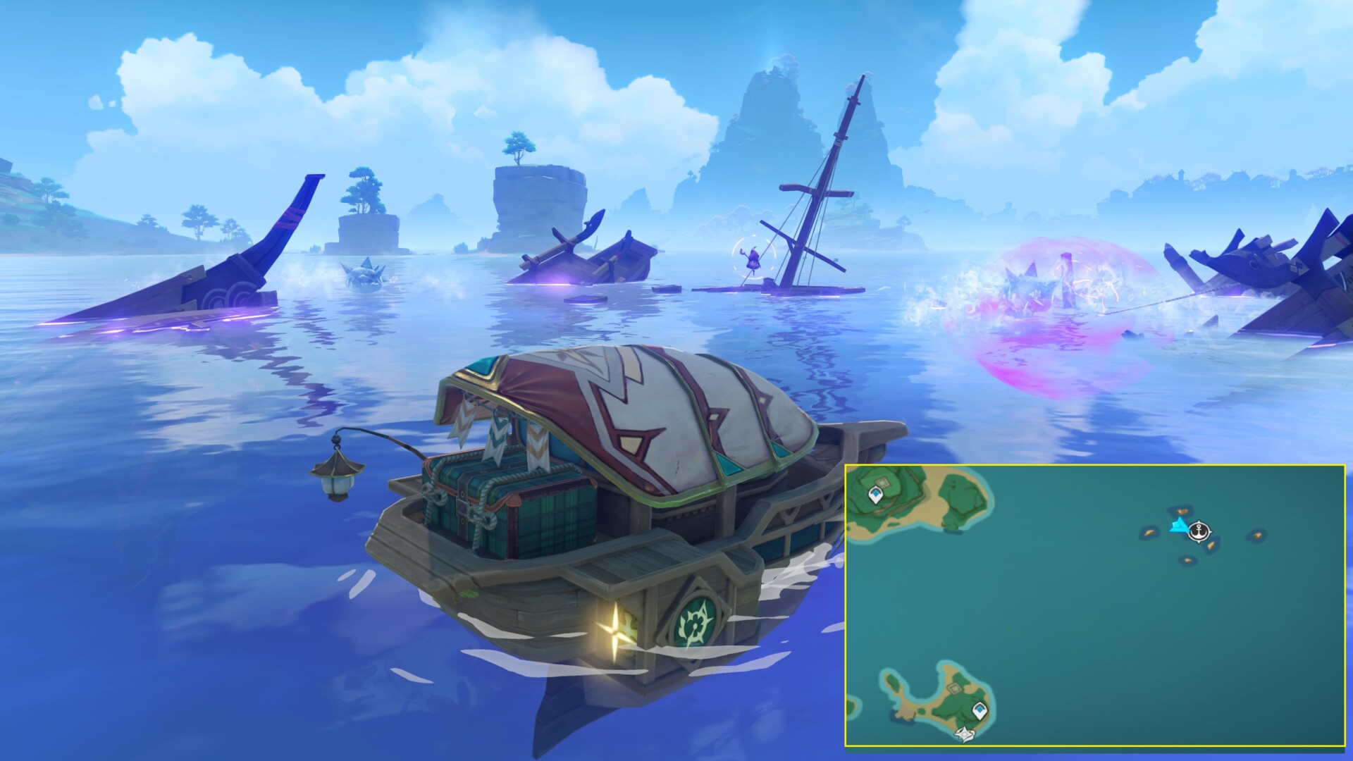 If you use the teleporter with the Waverider waypoint at the eastern part of the island, you’ll notice an area with a shipwreck. The problem is that there are 4x Cryo Slimes and 1x Electro Abyss Mage waiting for you. Because you’re surrounded by a body of water, it can be tough to take out enemies. My suggestion would be to stand on the wooden planks near the mast, all while trying to get your opponents close to you for an AoE nuke.