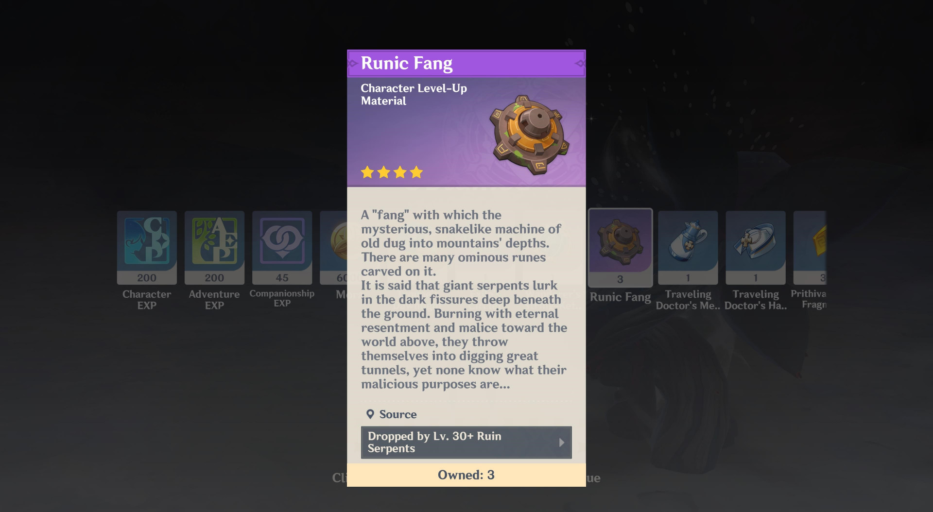 Defeating the Ruin Serpent in Genshin Impact nets you the Runic Fang material. Oddly enough, not a single character in the game uses it (as of version 2.6).