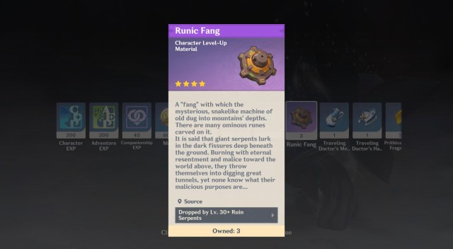 Defeat the Ruin Serpent boss for the Runic Fang item in Genshin Impact.