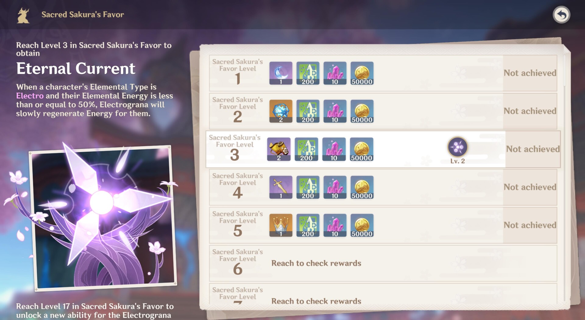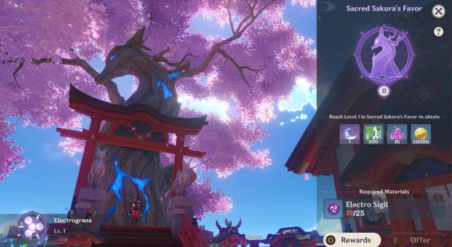 Anyway, the Sacred Sakura requires Electro Sigils to level up your favor. This resource can drop from treasure chests, bounty completions, and as quest rewards. For each favor level up, you’ll obtain various rewards such as gold, ores, crafting materials, talent materials, and more.