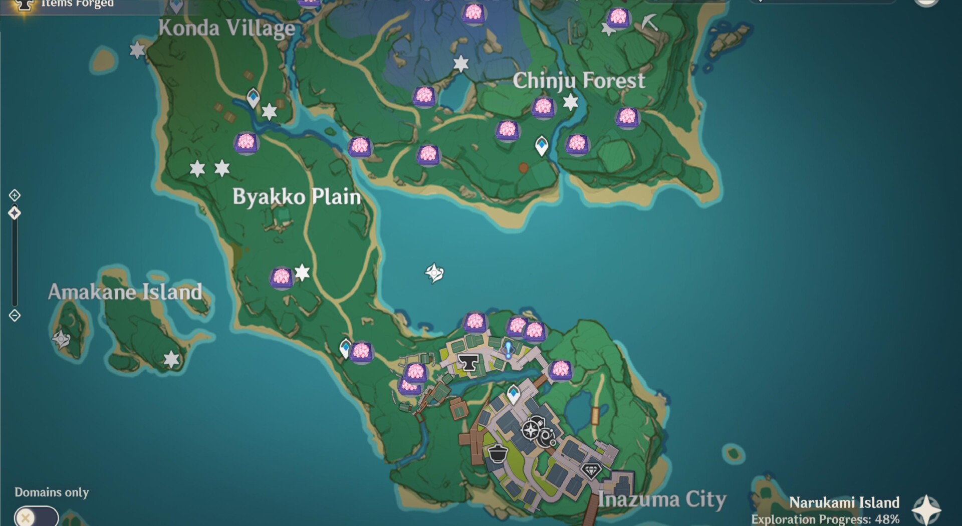 Both Byakko Plain and Chinju Forest have a few of these. Inazuma City, meanwhile, has seven nodes. You’ll find one near the fast travel point, two close to the water wheel, and four at the cliffs and walls to the north. The fortress itself and surrounding islands don’t seem to have any nodes at all.