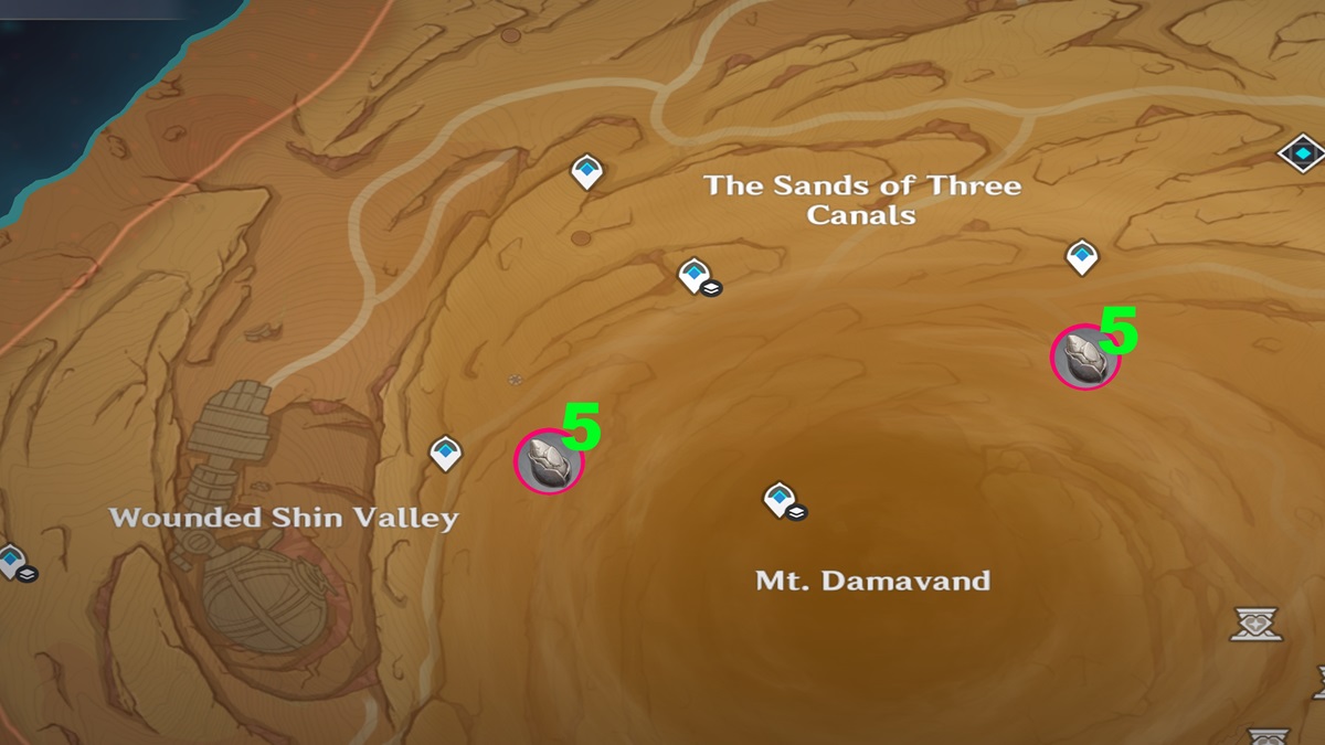 - Sands of the Three Canals – Move south of the fast travel point. The nodes can be hard to see if sandstorms slightly darken your HUD.