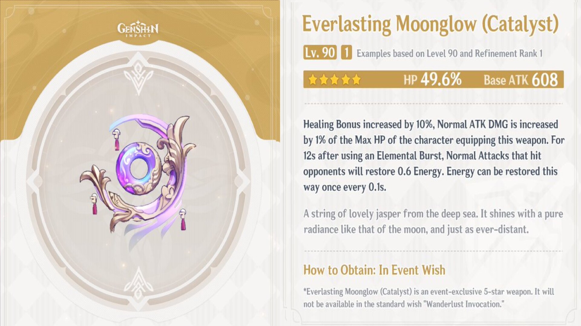 Everlasting Moonglow (energy recharge) – If we’re solely looking at the featured weapon in the Epitome Invocation banner, then we can consider the Everlasting Moonglow as the best weapon for Sangonomiya Kokomi in Genshin Impact. Apart from the energy recharge sub-stat, this 5-star catalyst has the following perks:
