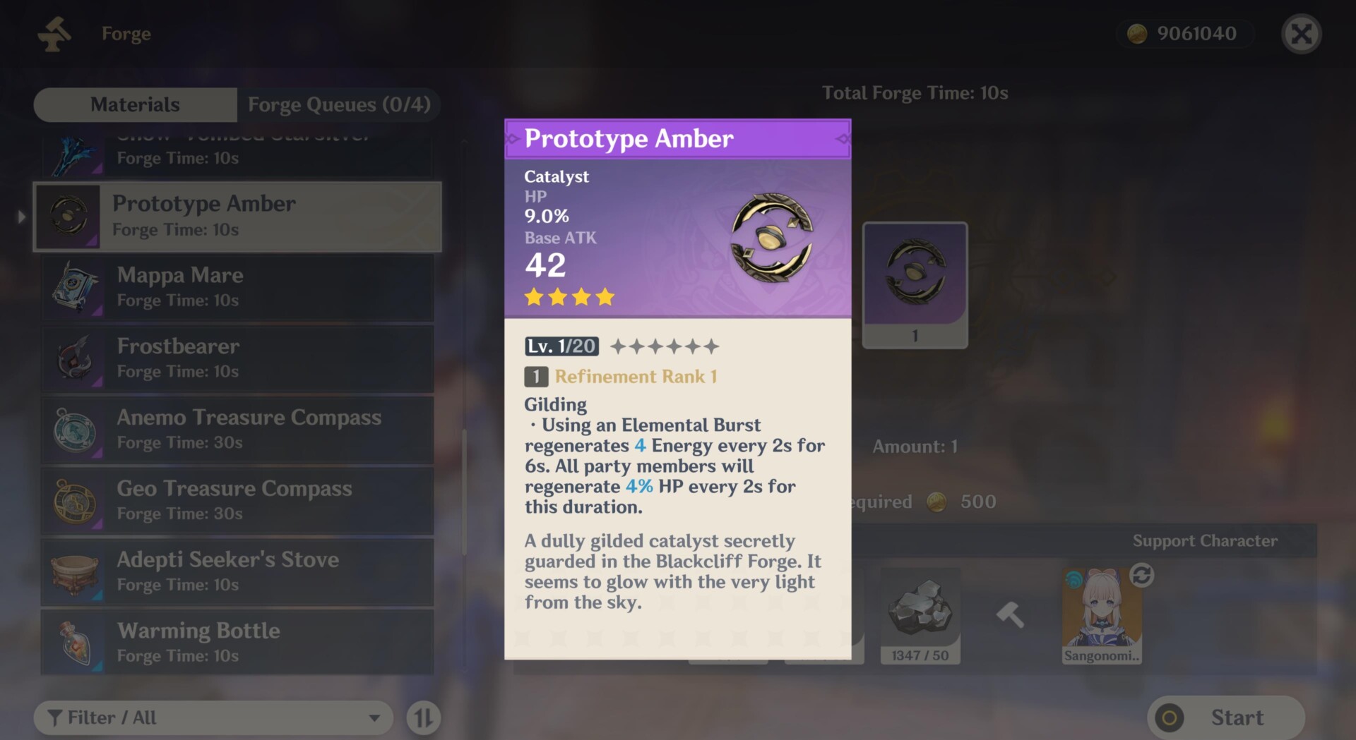 Prototype Amber (HP%) – The Prototype Amber is an okay choice, especially for pure free-to-play gamers, since it comes from the blacksmith’s forge. It’s got HP% as a sub-stat, and it provides energy and HP regen for your party after using Kokomi’s burst.