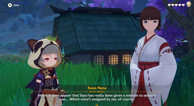 Next, you’ll go to the outskirts of Inazuma City in a section called Shuumatsuban Visitation. Here, you’ll meet a Shrine Maiden named Kano Nana (she’s in charge of Sayu’s training). You’ll also learn that someone wanted Sayu to ambush the Traveler. In any case, this leads to multiple branching options that we detail in the pages below: