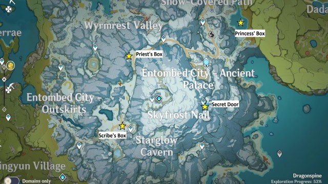 There’s a lot of stuff to discover in Genshin Impact‘s Dragonspine region. One of those happens to be the secret door found at the top of Starglow Cavern. You’ll need to find the Princess’ Box, Priest’s Box, and Scribe’s Box to open it. Here’s our guide to help you out.