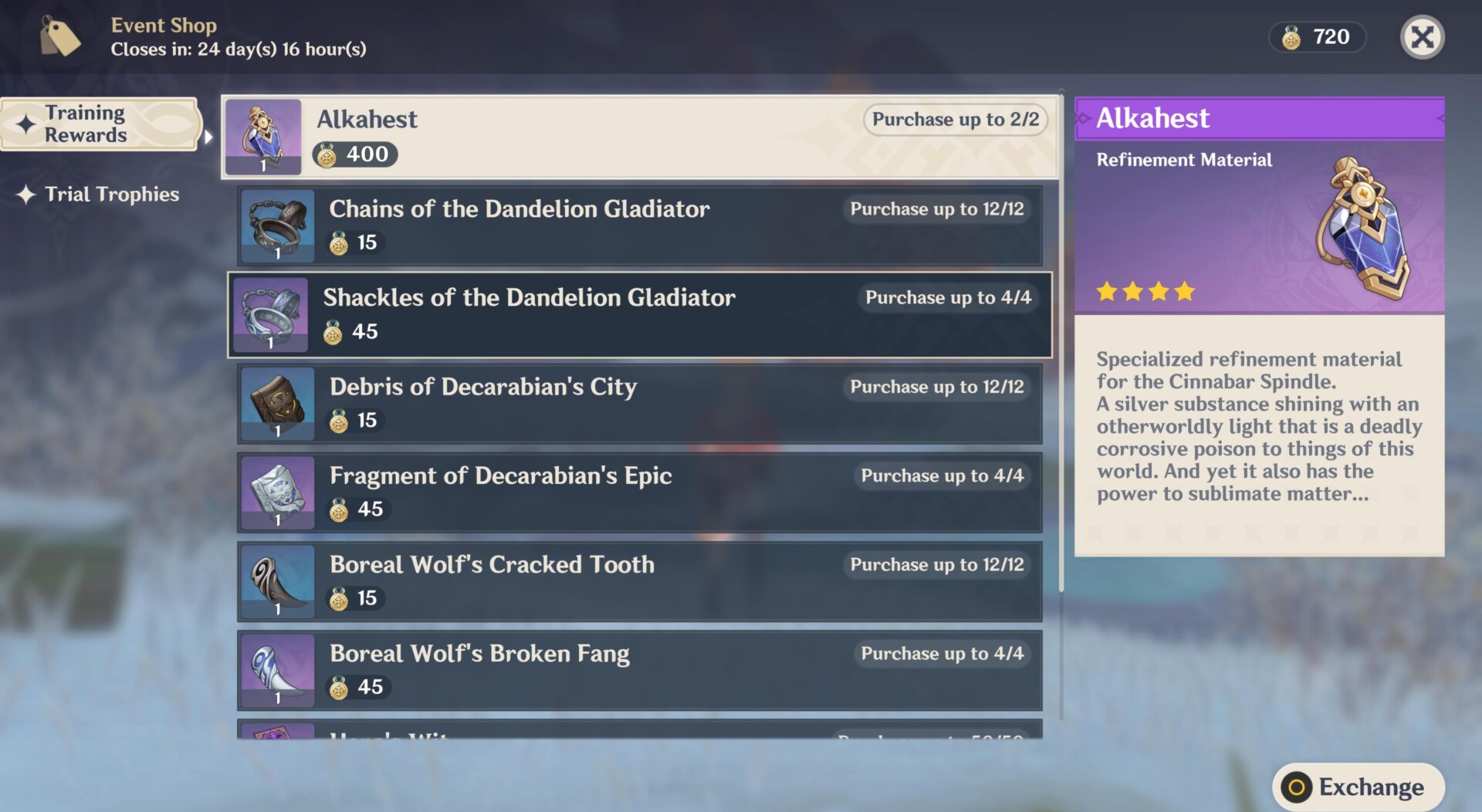 | Alkahest – Used as a refinement material for the Cinnabar Spindle | 400 | 2 |