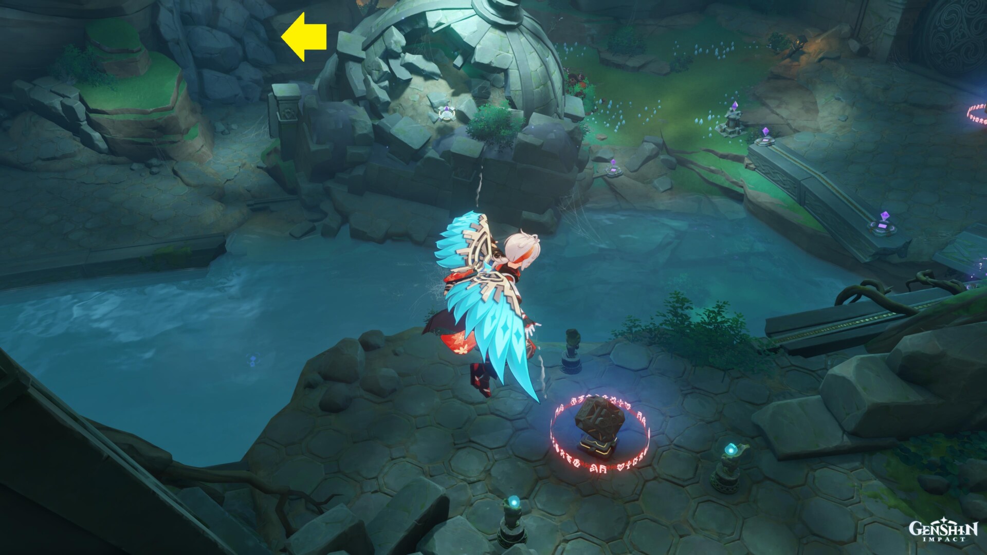 The feathers are actually down below in a submerged area. Your goal is to tag all the nearby Seelie so they move to the three pedestals next to the tree. They’re found in the entrance, off to the right, and down below near a Thunder Bough. After all the Seelie are in the correct spots, a chest will appear and the water will be drained.
