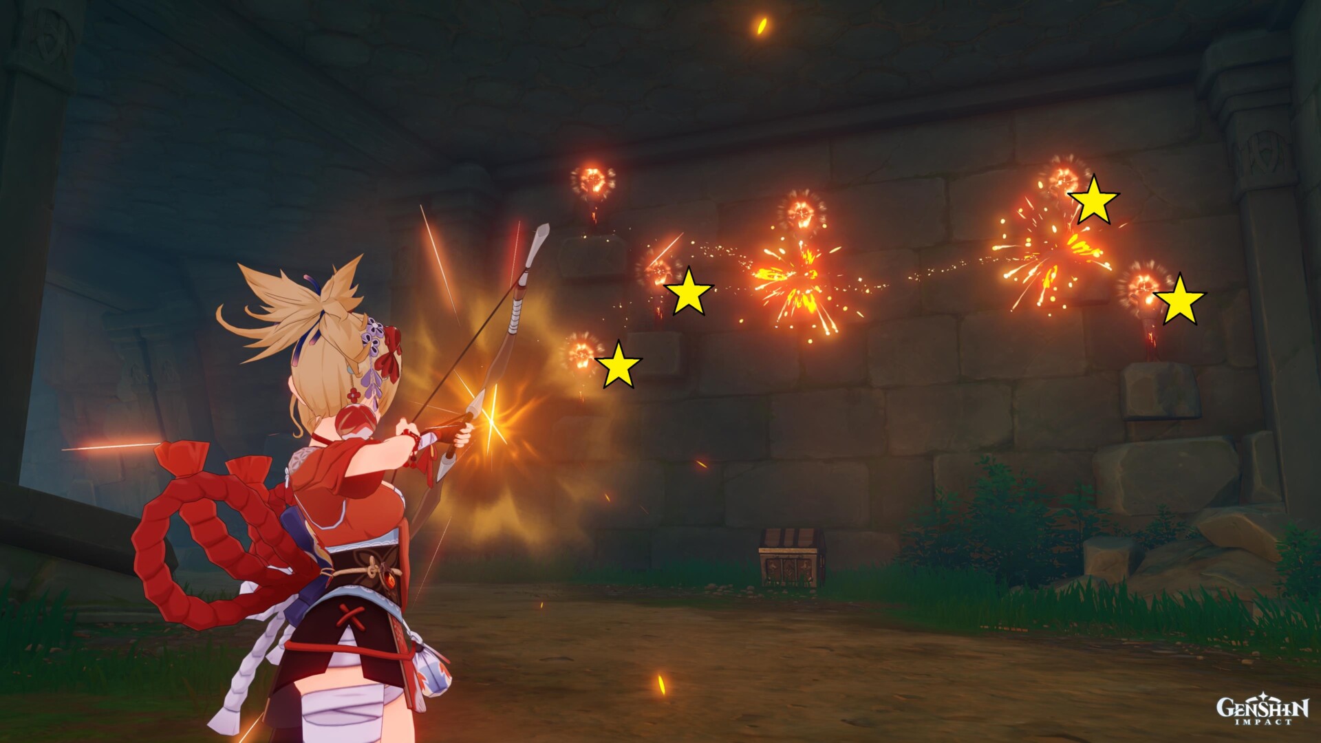 Again, with the highlighted stars as clues, we’ll need to shoot only the correct torches. You’ll also receive another chest here.