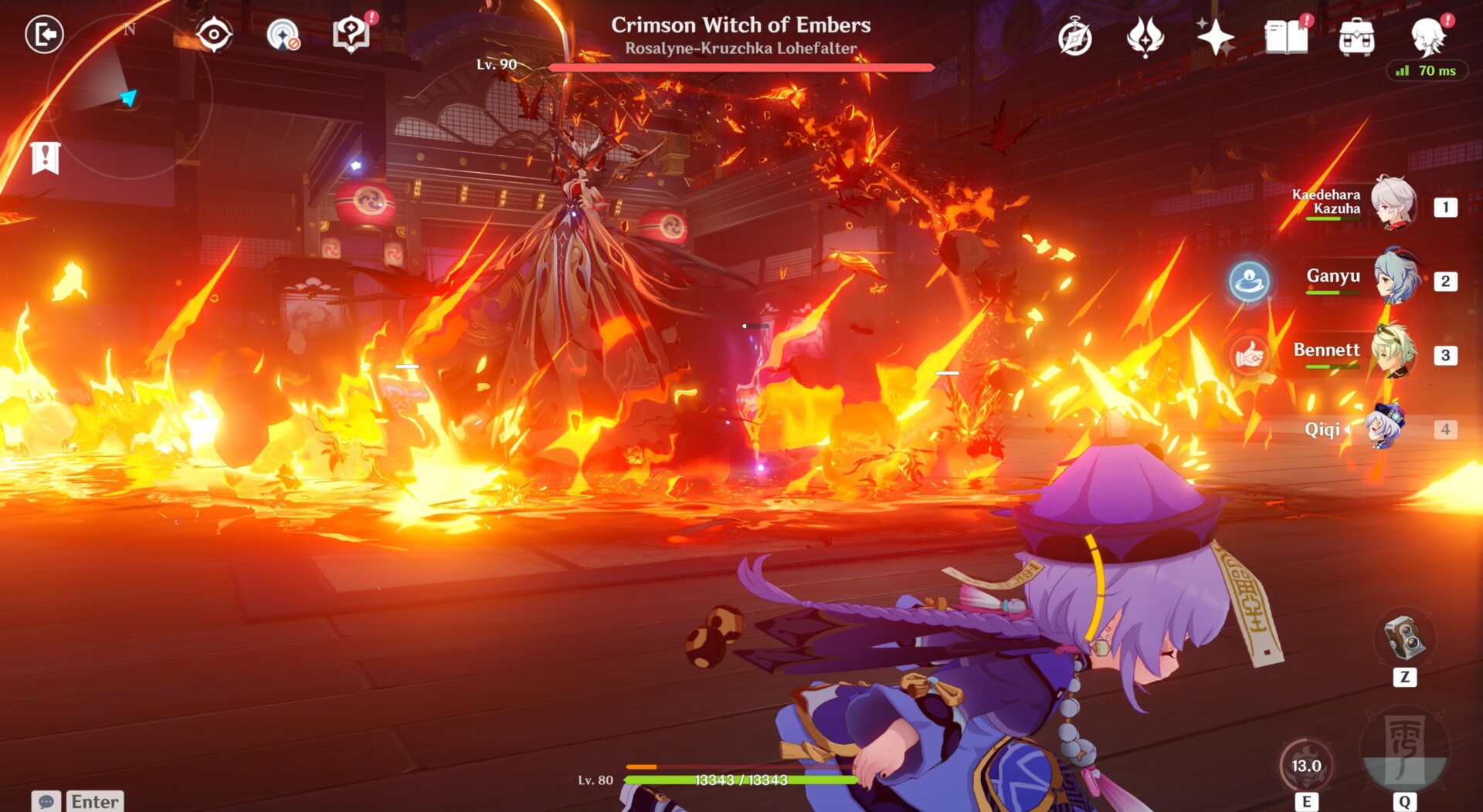 Getting hit by her Pyro abilities will cause the Blazing Heat debuff (denoted by a bar). As usual, you’ll lose HP if it’s full, so try to break the Cryo crystals in the corner of the room.