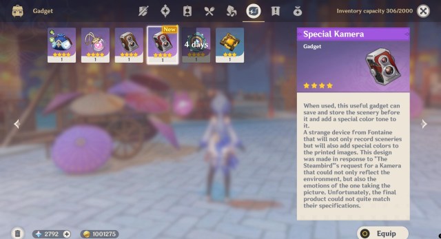 The gadget’s description states that it was made when someone suggested an item that not only took pictures, but also captured a character’s mood. In a way, the Special Kamera does just that. It’s good for close-up shots of your characters, though it’d look weird if you’re trying to take dynamic, action-packed shots during fights.